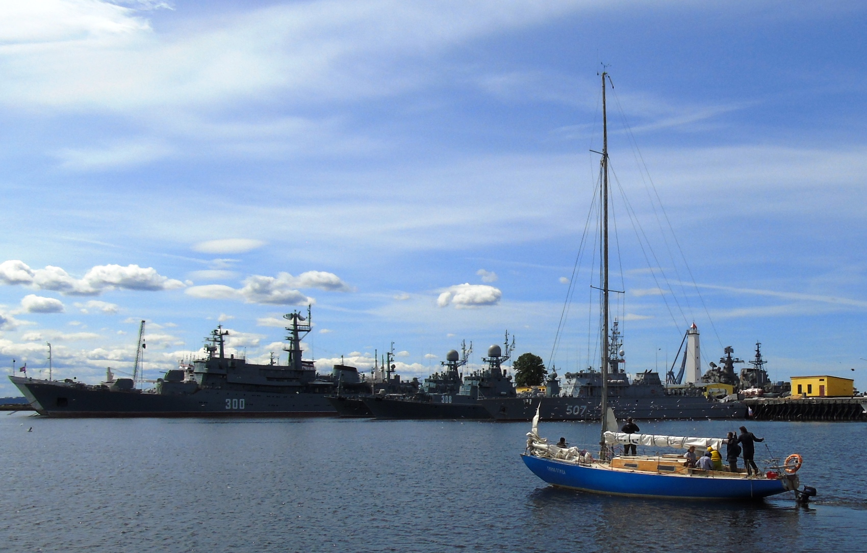 Мелкие суда ждут прохода военных кораблей (парад). Экспозиция военной техники. Редко бывает открыта.