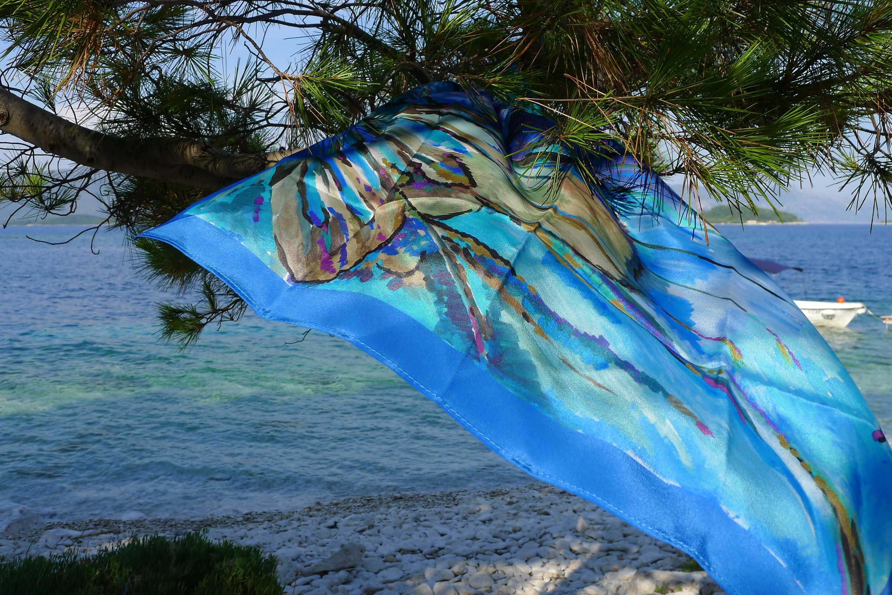 Платочек, пронизанный ветром странствий, в котором бирюза моря, синева неба, белизна парусов, хвоя и кора прибрежных сосен, запахи мирта, розмарина, кофе из уличных харчевен, разлитая кругом атмосфера праздности и неги.
