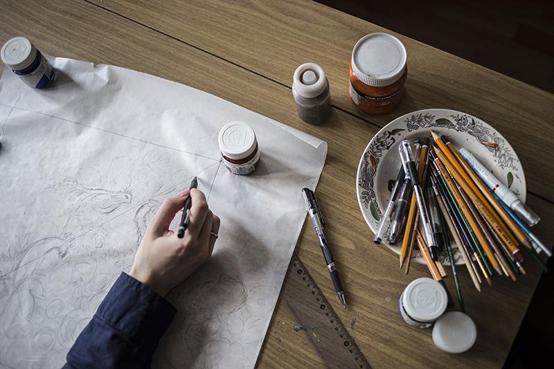 Павловопосадский художник создает рисунок для платка — кроки — в натуральный размер гуашью на листе ватмана.