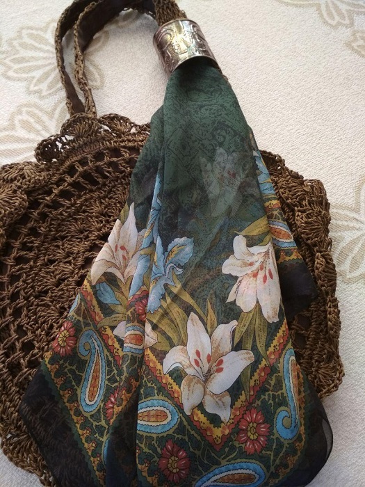 ELEN-A, Вы открыли мне глаза на чудесный платочек! ^% Даже обидно стало, что крепжоржетовым практически не уделяют внимания на форуме. :( Комплект хорош, гармоничен. Особенно умилила эта медная муфта для платка на третьем фото :: . Тоже такую хочу, именно медную или бронзовую.