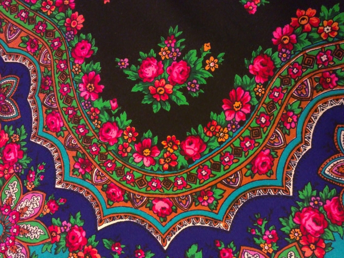 Незнакомку подарил мне муж на рождественской ярмарке в Суздале: я увидела эти яркие цветы и рука сама потянулась к платку. (Кликните, чтобы почитать оффтопик)... Я носила его всю зиму на голове с длинной черной приталенной дубленкой. Теперь - с маленьким черным платьем. Не замерзала в нем и в сильные морозы. Люди порой реагируют на платок неадекватно, но "палец у виска - не дуло револьвера"