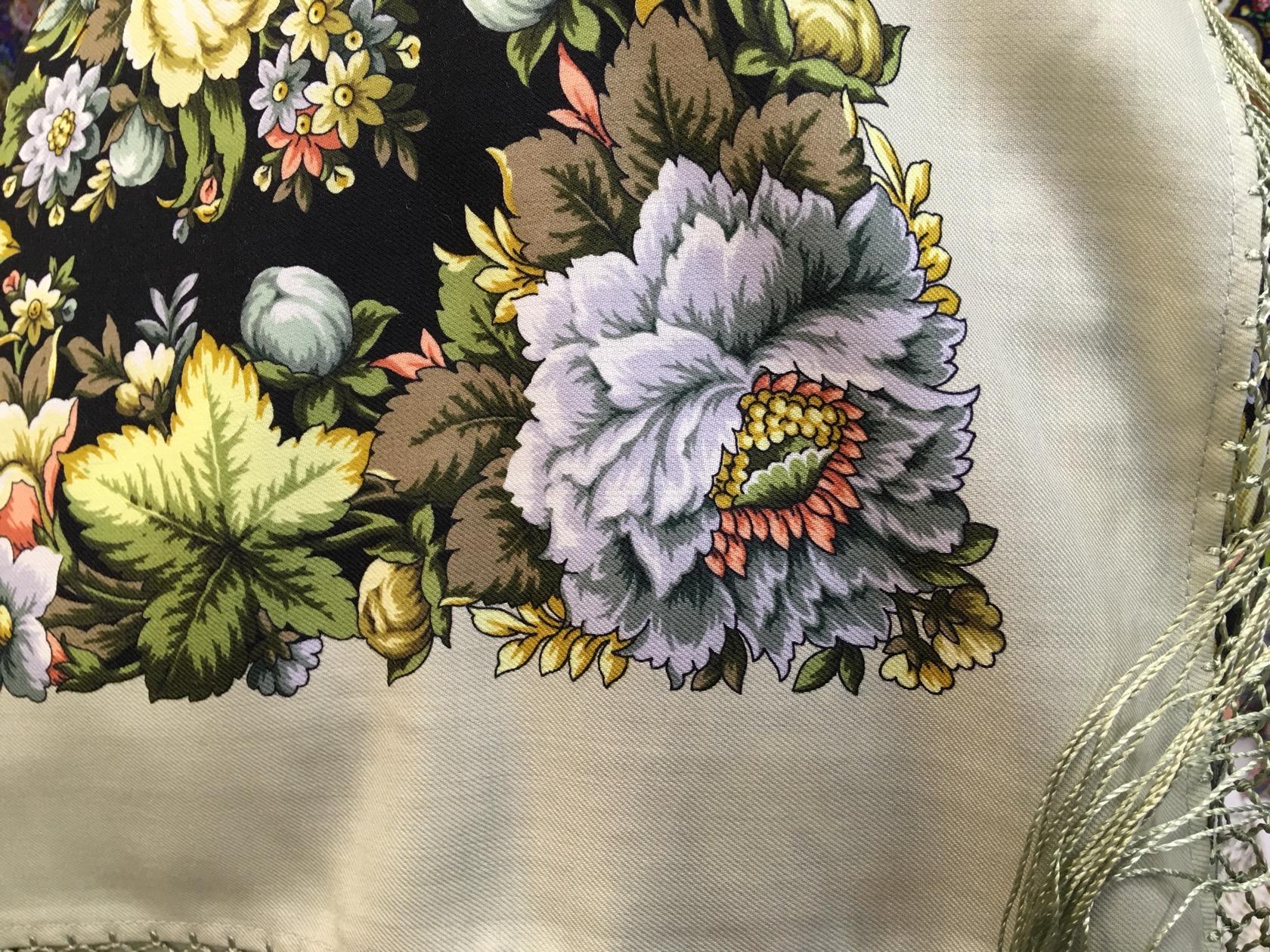 Тона этой шали очень зависят от освещения. Фотографии сделаны в фирменном магазине ППМ м."Курская". Шаль - стандартного сорта. При увеличении фотографий хорошо видны мелкие брызги краски.