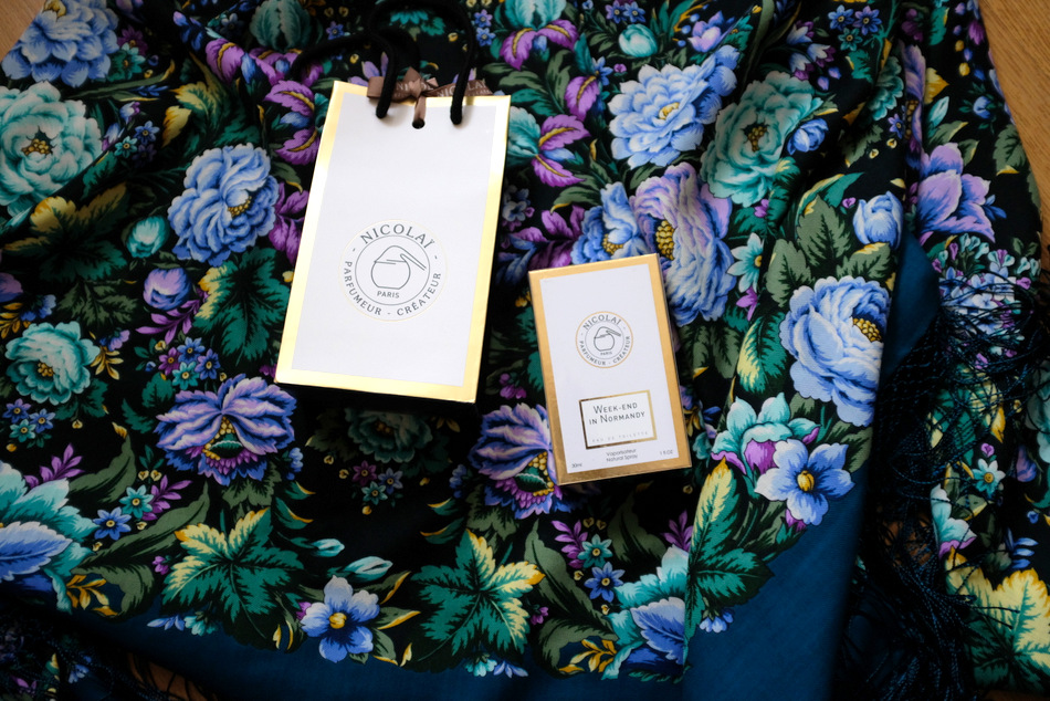 В развивающихся на ветру концах шали Диво дивное,а ветер был сильнейший, я рванула вчера на Кузнецкий, и вот он у меня - мой долгожданный флакон! Правда теперь, в новом издании он называется Week-End in Normandy, ну так это еще и лучше - точно обозначает место действия аромата. Сам аромат от прежней версии почти не отличается.