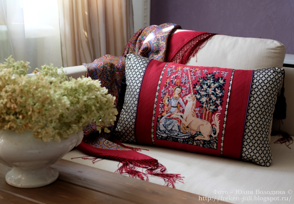 Сюжет Дамы с Единорогм считаетается чуть ли не культовым для вышивалиц. Несколько вышивальных фирм сделали разработки дизайнов для вышивки на основе знаменитого изображения. Буквально на днях, я закончила вышивку от французской фирмы Princtsse с сюжетом на основе этого гобелена, которую мурыжила несколько лет, и оформила её в подушку. Позволю себе вставить фотографию своей работы сюда, хоть и совсем не по теме, а просто иллюстрация к рассказу. Парфюма в кадре, увы, нет, но шаль имеется. Только у меня не тот гобелен, про который духи, не "Моё единственное желание", у меня сюжет из гобелена, посвященному чувству "Зрение"