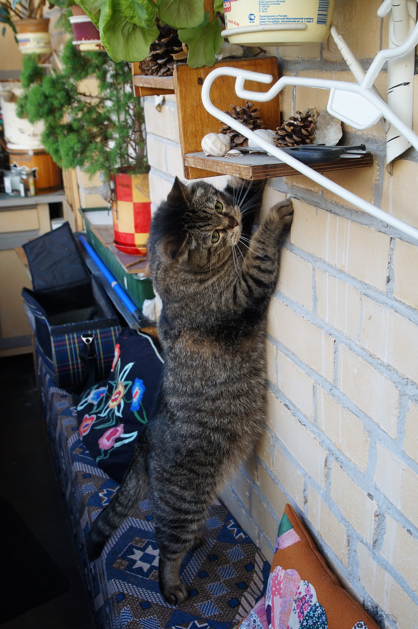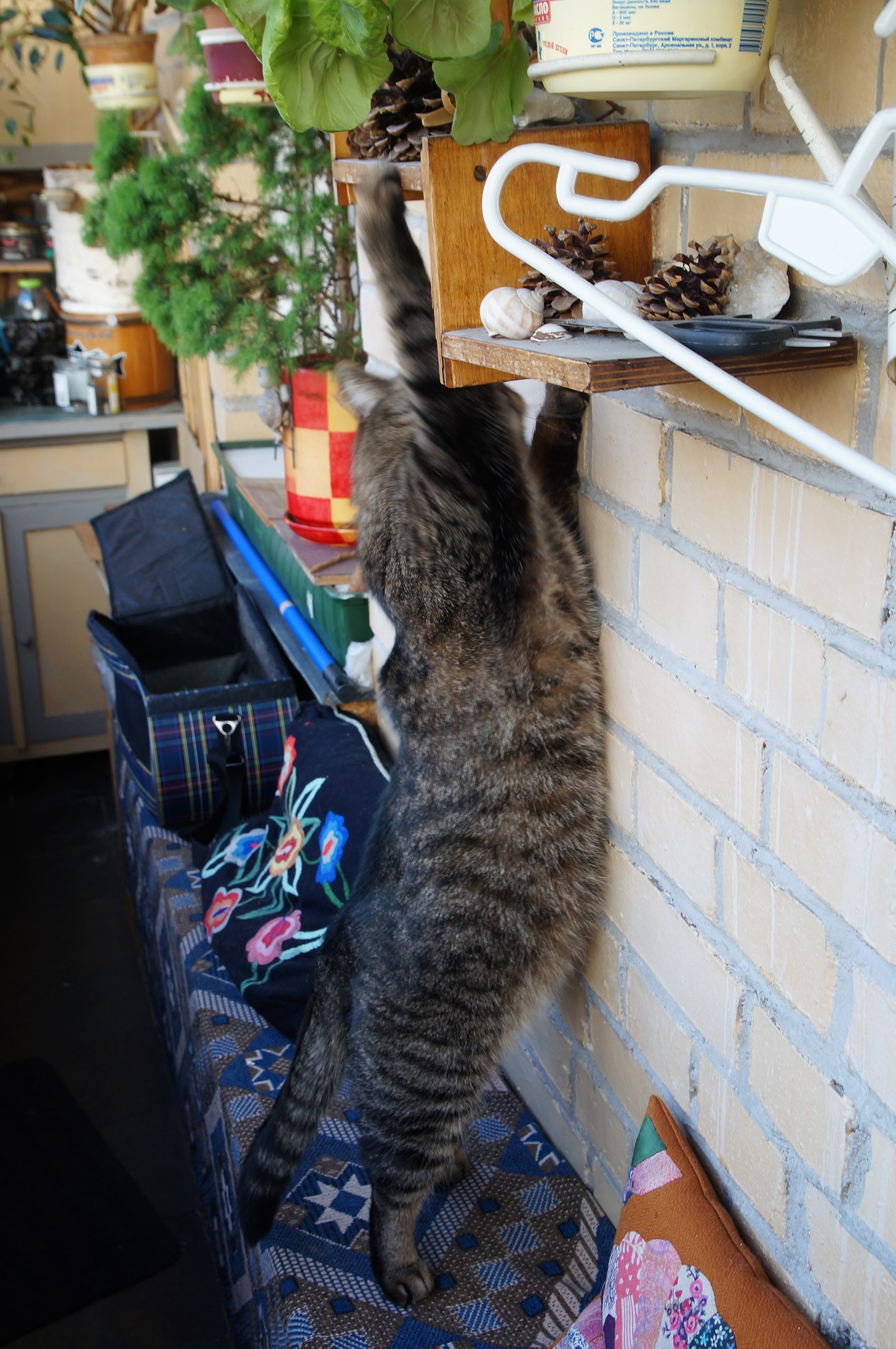 А дальше было вот что. Кот активно участвовал в процессе переселения цветов на лоджию. Помогал как мог! До всего было дело, до каждой шишечки и веточки.