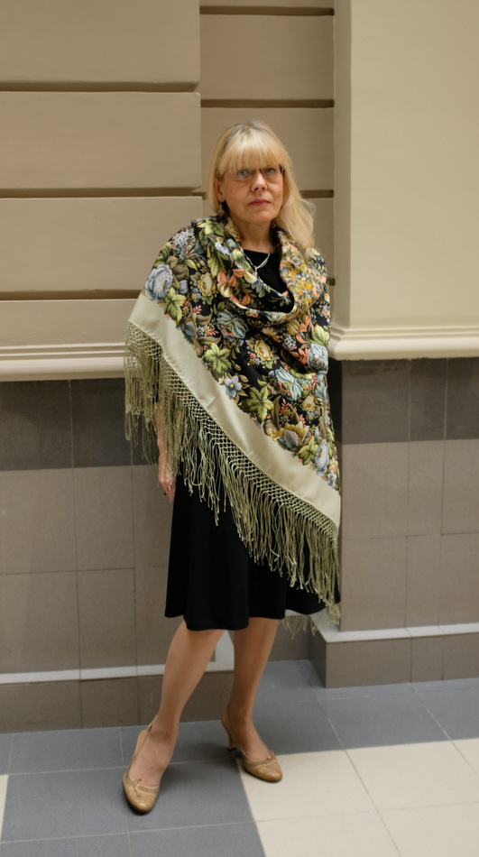 Как же Ларисе идёт Диво дивное 2! Она как накинула, у меня прямо мурашки по коже. Точное попадание! И с этим черным платьем. Фон шали сливается с платьем, а рисунок, как будто соткан в воздуже, и так нежно окутывает фигуру. Прелесть!
