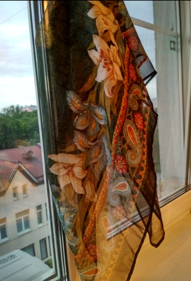 Oreshka, Воздушный поцелуй из окна - как романтично :: . Платок очень красивый, жаль, что редко показывают креп-жоржет, и новинок в этом разделе мануфактура не предлагает. Мне бы даже хотелось размер побольше. :)