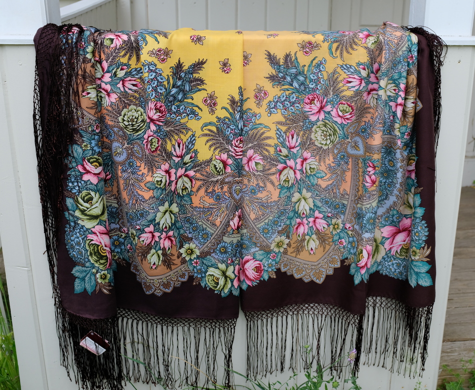 Перевыпуск Июньского утра, тем, кому очень нравилось старое, и кто его, старое Утро, видел живьём, скорее, не понравится. На фото при сравнении обеих шалей, особенно в намотке, если не придираться, трудно различить. Именно на фото. В реалии, разница очень заметна. Современная печать Июньского утра - это изнанка старого, один в один, чуть середина желтенькая отличается. А остальное...