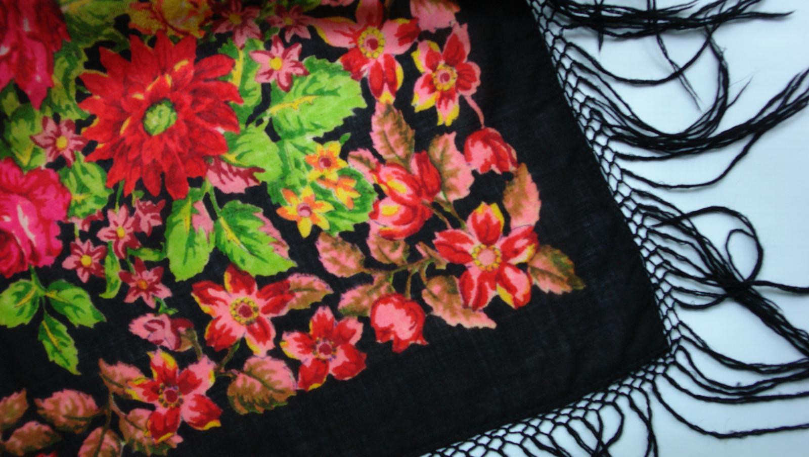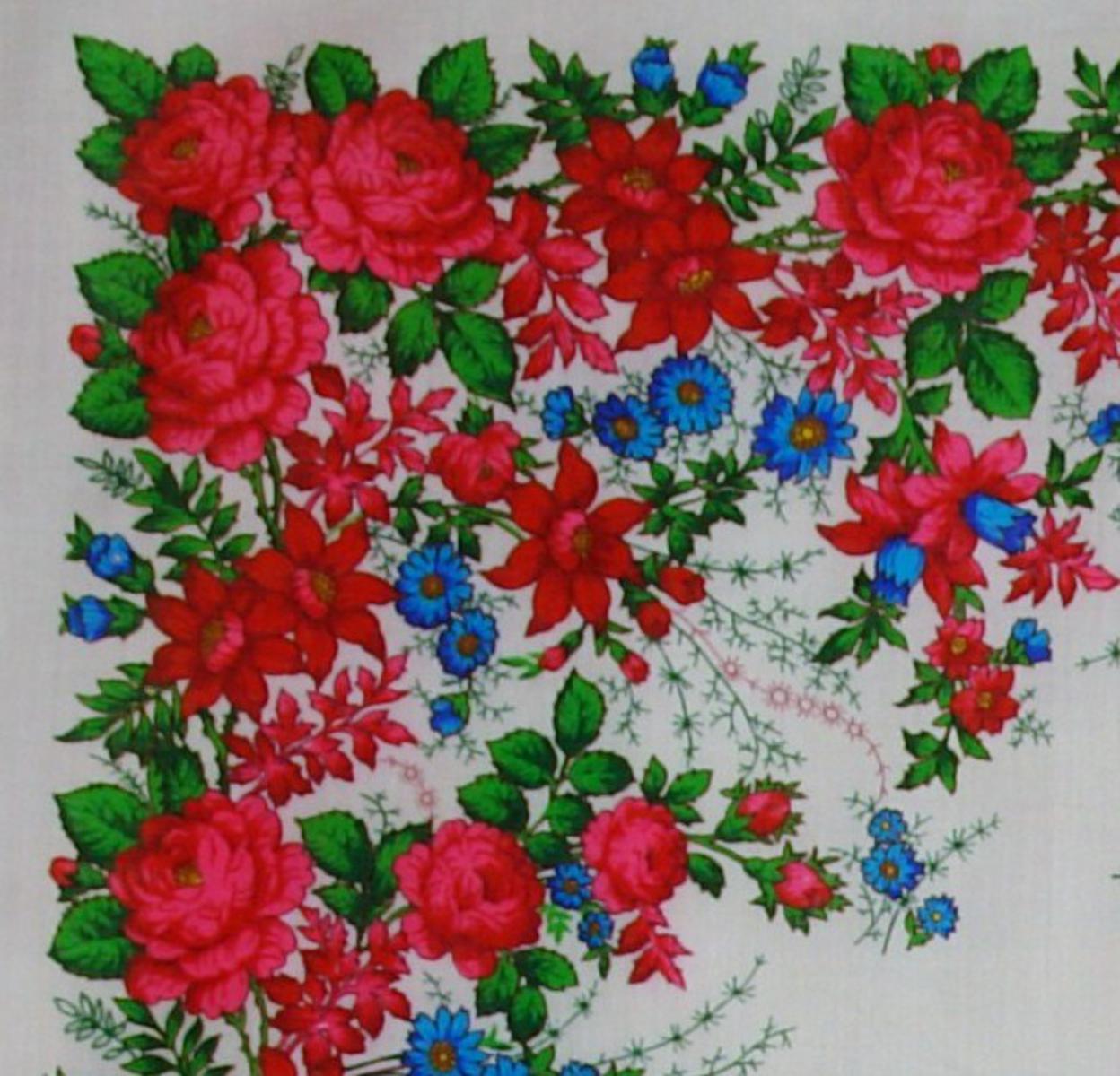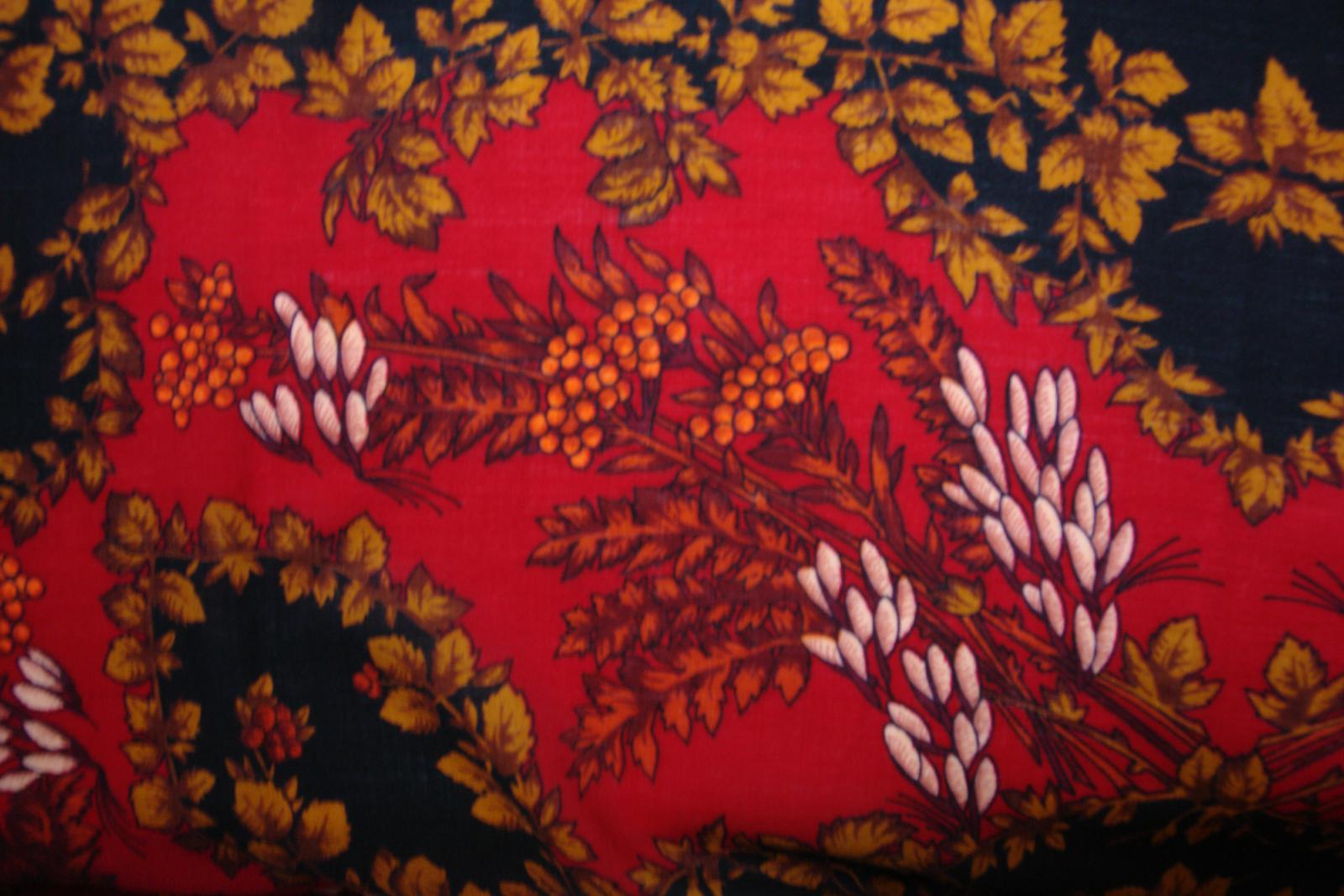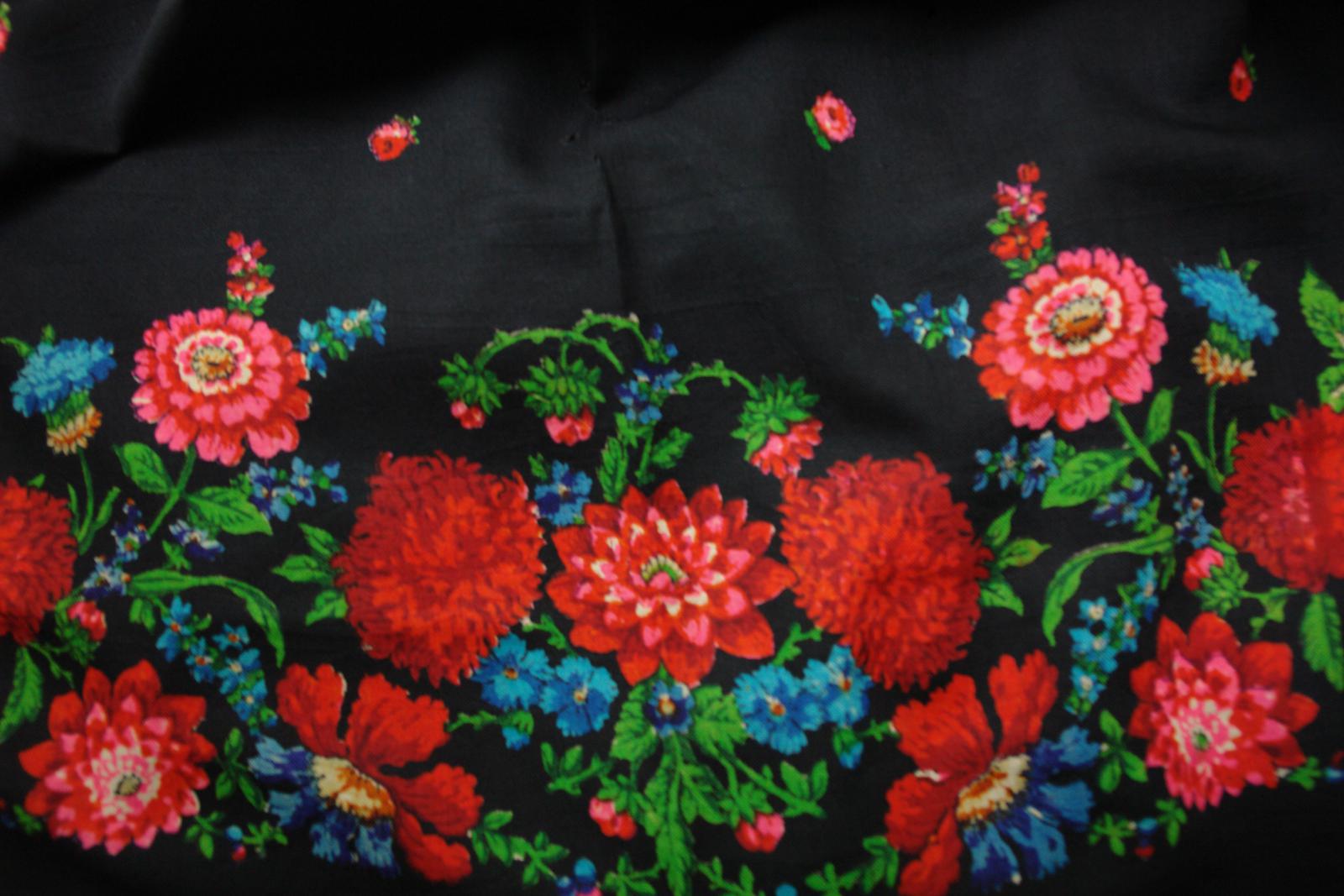 Шаль довоенной ручной набойки с цветочным мотивом по кайме