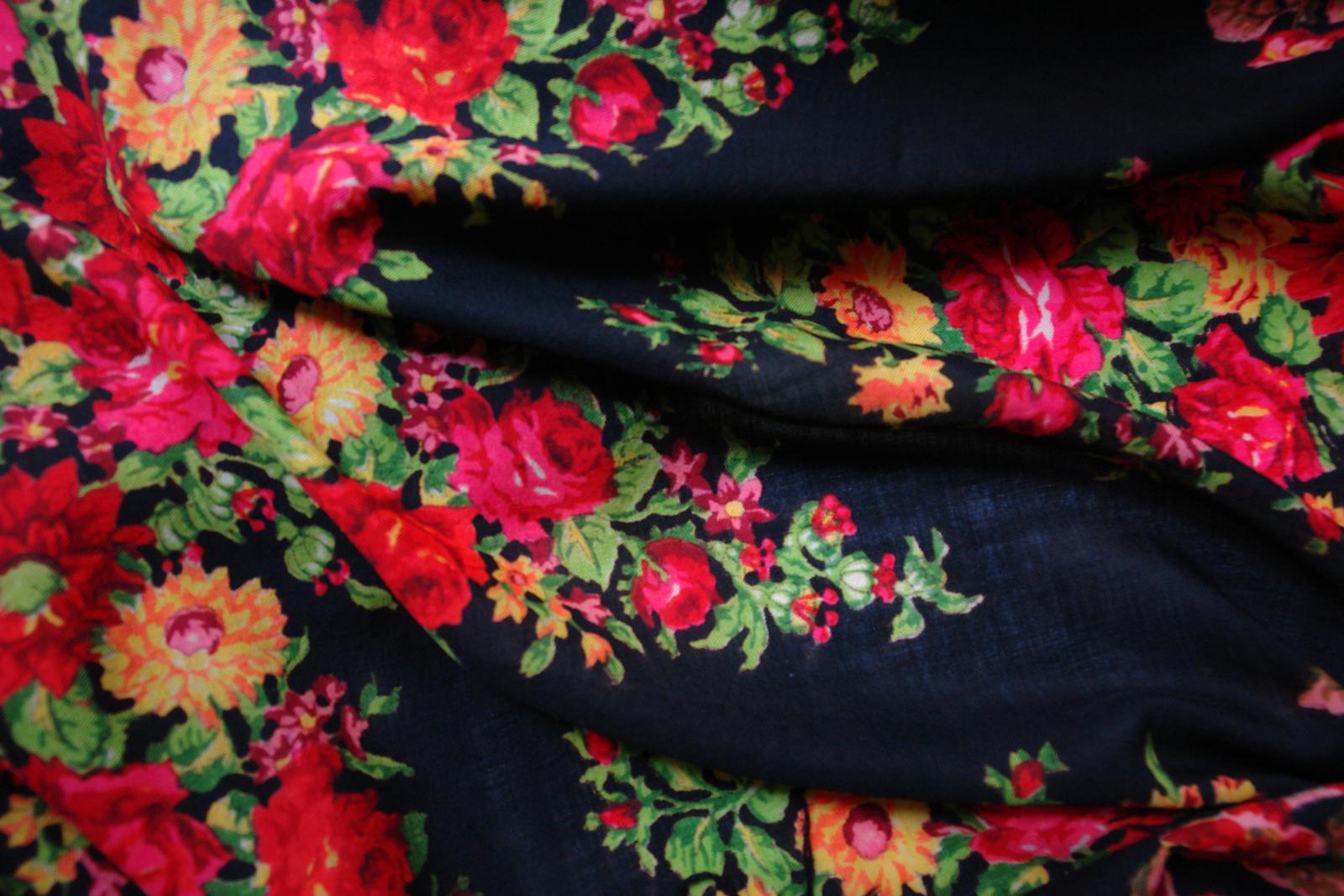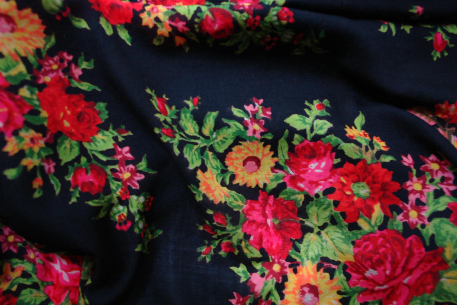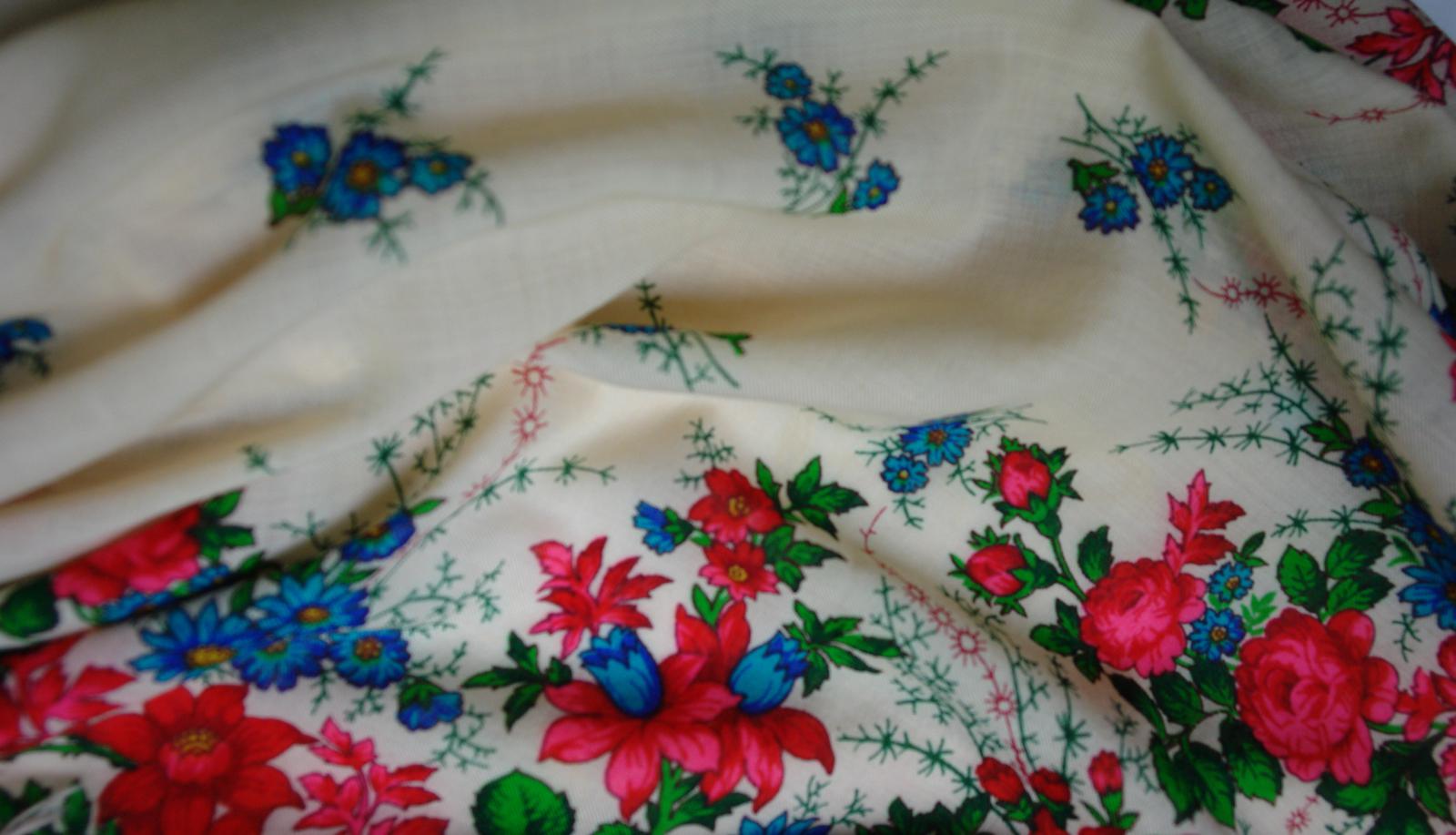 Шаль довоенной ручной набойки с цветочным мотивом по кайме