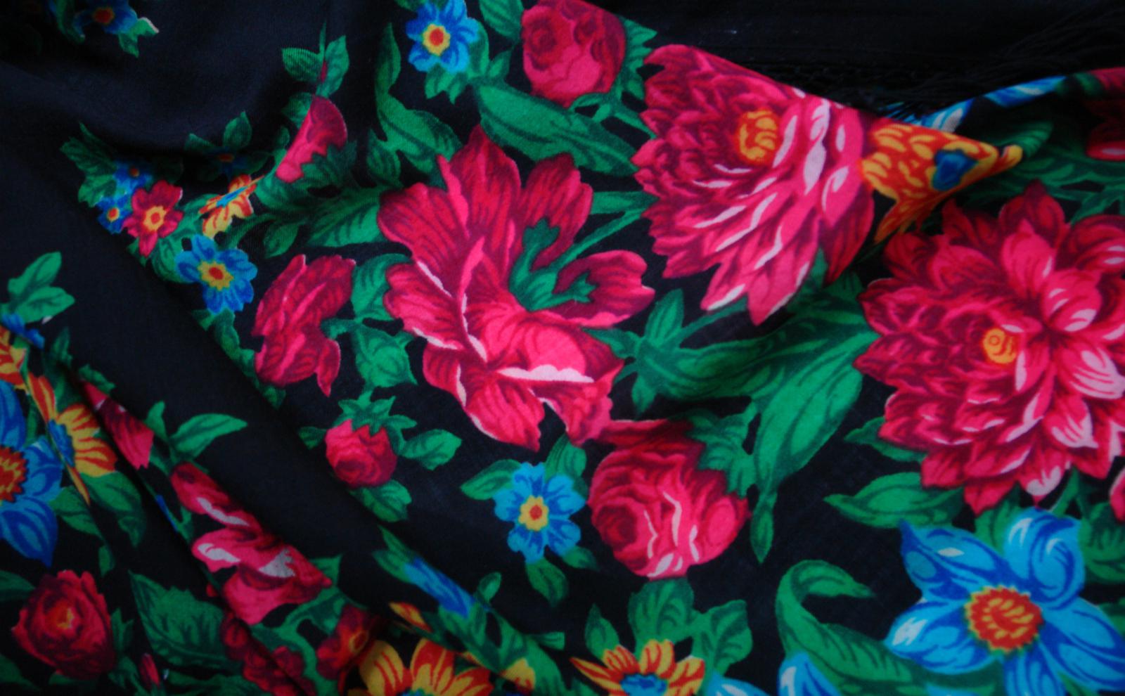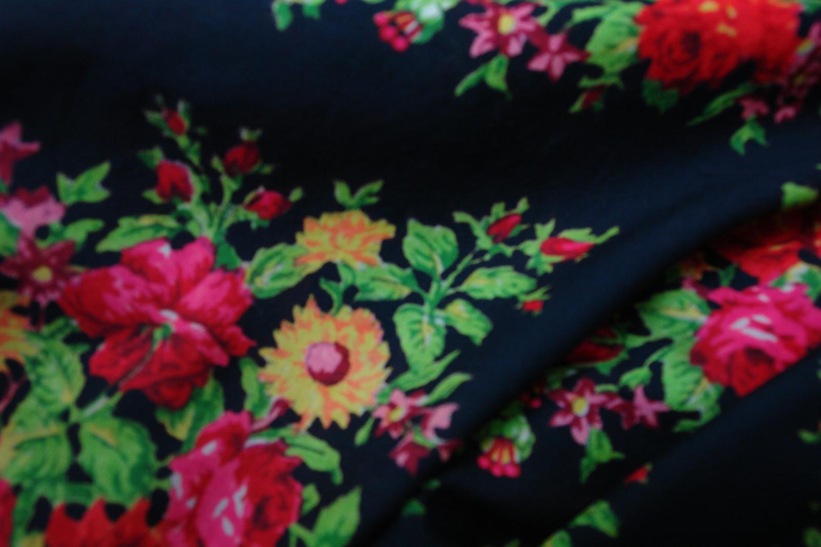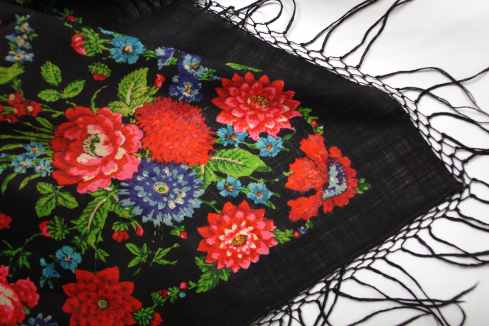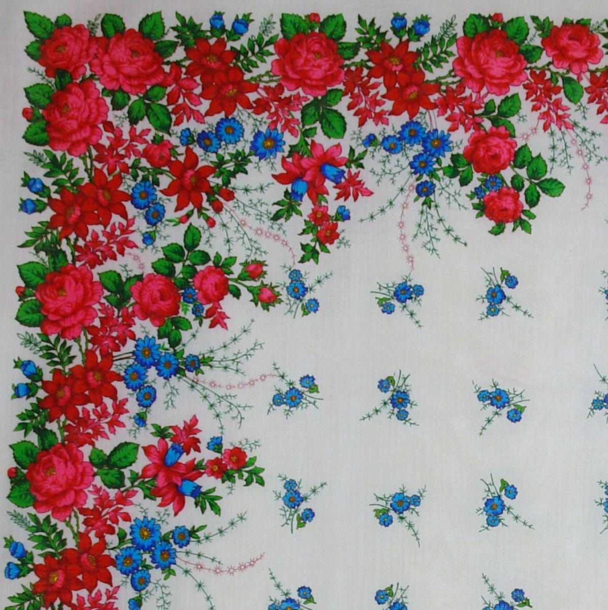 Шаль довоенной ручной набойки с цветочным мотивом по кайме