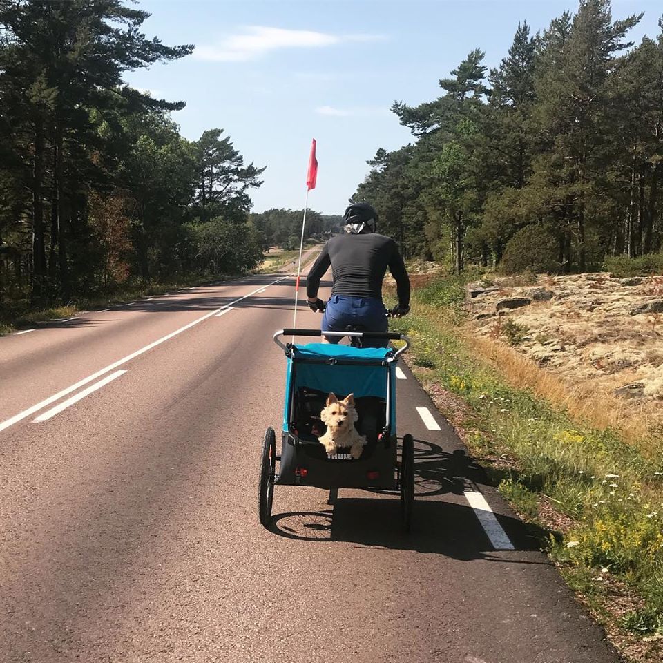 А наша собачонка Шуша путешествовала по Финляндии и Швеции в велоприцепе вместе с детьми. Очень удобный размер у норвич терьера. После всех походов отдыхает в галошнице.