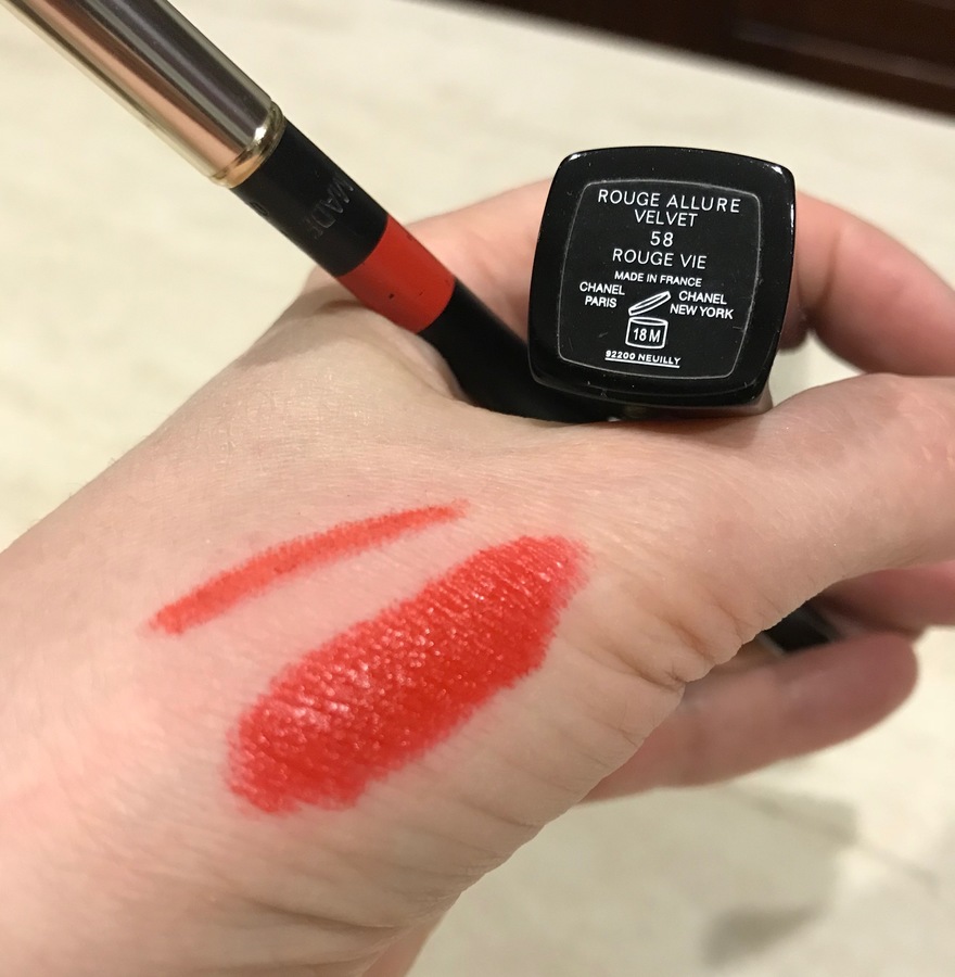 и помада Шанель ( Руж Аллюр Вельвет) номер 58. На последнем фото --цвета самые близкие к оригиналу.
