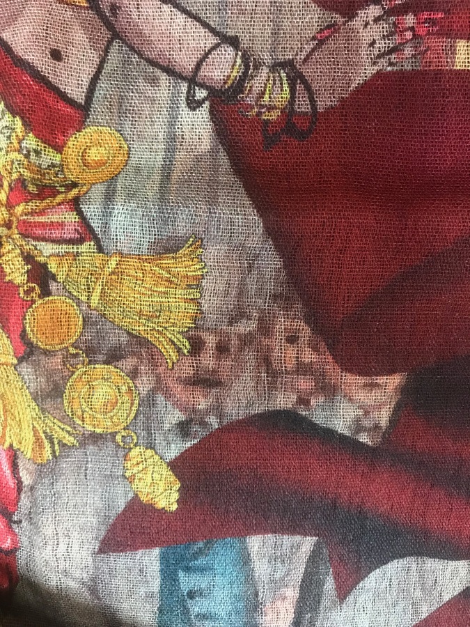 Первое что пришло на ум, при примерке--"Шапито", арт-деко, "ревущие 20-е"-- (Кликните, чтобы почитать оффтопик).... Палантин красивейший, особенно кому подходят такие оттенки, которых миллион. Очень акварельный, сочный. Как ни билась--камера не передает точные цвета. Основные оттенки фона глубокие (на фото выбеленные)--банан, розовый персик (необыкновенной красоты, без детскости), тыква, дыня. Поначалу не понравился огромный слон, но он легко драпируется. Цвет слона не серый, а бурый, серо-зеленый.Из акцентов--оттенки чистого, теплого изумруда ,зеленки, травы, сизый. (Еще фото выложу в примерочную)