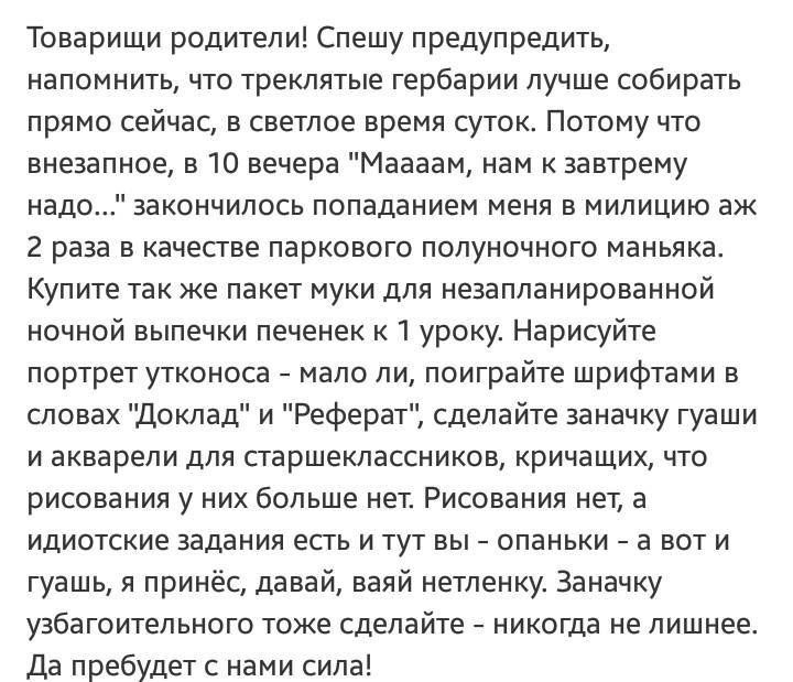 Mlava! :lol: . Про гербарий - помню: именно так,часов в 10 вечера младшенький вспомнил о том самом гербарии, листья им ,блин,осенние понадобились. Весь день с собакой в лесу гуляли... Ночь (ну,поздний вечер),дождь... Мы с оболтусом бежим в ближайший парк (благо,за углом). Фонари стоят на каждом километре, кроны в вышине угадываются тёмной массой. Собрать надо не менее 10 видов. Парк изучен до травинки, но в дневное время. Лихорадочно начинаю вспоминать,где какие деревья расположены. Потом... ржали в голос все белки разбуженые тёткой, в высоком прыжке обдирающей ветки