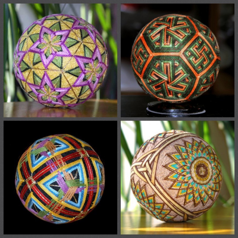 А темари - дело техники, которую я осваивала просто по картинкам и описаниям. Сложно кажется, пока не сделал. Я была очарована этой сферической бесконечностью поверхности. И делала всё по классическому японскому рецепту - не использовала каких-либо болванок, шарики формировала сама из лоскутов от "старых кимоно")) и ниток. Шары тяжёленькие и плотные. До супер-сложных дизайнов не дошла, но несколько шариков вышила (и одно яйцо)). Однажды я уже показывала здесь на форуме какой-то из темари.
