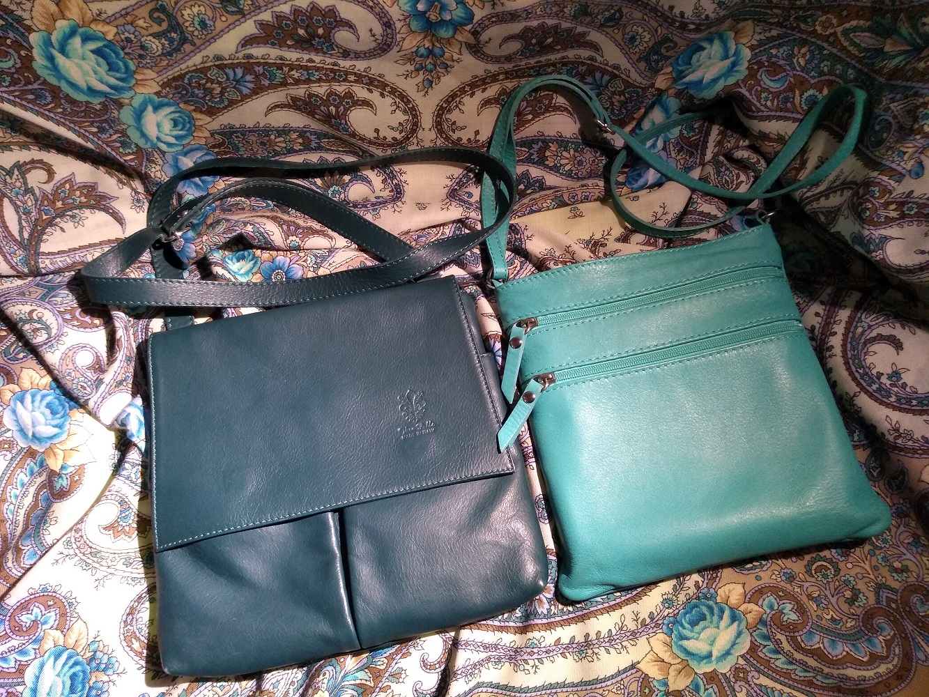 Сумки покупались не по принадлежности к брендам, а по зову души, поэтому вопрос о брендах освещать не буду. Вижу и понимаю, что все, пропала :<>: оно мне надо! Осмысливая свои сумки, все таки радуюсь, что сумки первичны. Шали уже докупаются к ним. Но вот с 2 шалями, все же пришлось устроить танец с бубнами. Одна из этих шалей - Ожидание 7. Историю разорительной шали и танцев вокруг с бубнами, подробно описывала в Зазеркалье, позапрошлой осенью, там же выкладывала и фото с сумкой к ней. А вот вторым платочком , к которому купила сумку - как раз и оказалась зеленая Пелагея. Платочек уже давно, нежно его обожаю. А вот правильной сумки к нему не было. Носила его, так, не заморачиваясь, пока не увидела ее - зеленую красавицу! Вообще покупать сумки к платочкам - достаточно разорительное занятие, лучше уж наоборот. Стараюсь держаться этого принципа :lol:
