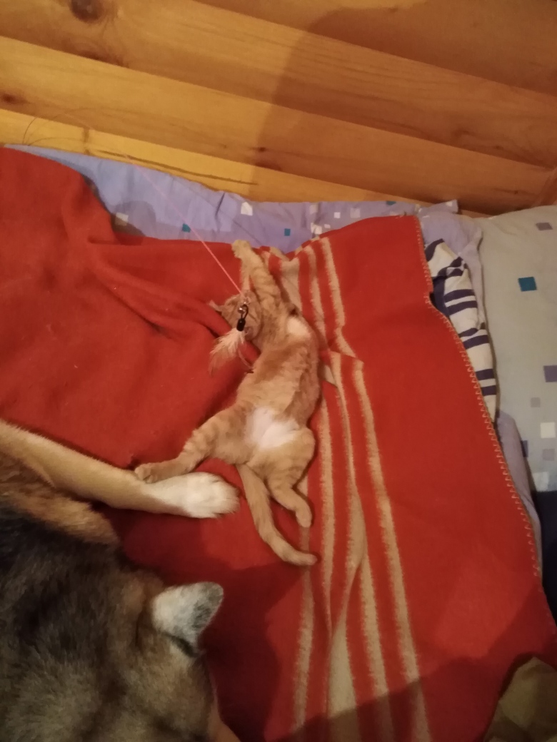 А к нам на даче пришла киска. вернее котенок, совсем крошечный, больной, кожа да кости. Было это в начале сентября...Прогнать мы не смогли такого несчастного ребёнка;)) Это оказалась котячья девочка;)) Назвали её сначала Рыжик, думали котик, так и осталась она Рыжиком, Рыжуней, Рыжулей:)) Были очень большие сомнения по поводу будет она у нас жить или искать ей новый дом и новых хозяев. Все из-за того, что в семье уже 8 лет живет собачий мальчик Басяня породы сибирский Хаски. Кто хоть немного знаком с этой породой меня поймут. По всем жизненным канонам кошка и Хаски в принципе не совместимы... На свой страх и риск решили попробывать их совместить...Прошло два месяца и вот что у нас получилось;)) Это они на даче нежатся на хозяйской кровати:)) пока хозяева розы укрывают на зиму...