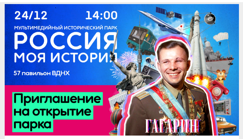 От лица проекта "Россия - Моя история" приглашаем Вас на грандиозное открытие 57 павильона ВДНХ. 24 декабря павильон откроет свои двери после масштабного обновления экспозиций "Рюриковичи", "Романовы" и "ХХ век"...С уважением, Команда проекта Россия - Моя история"