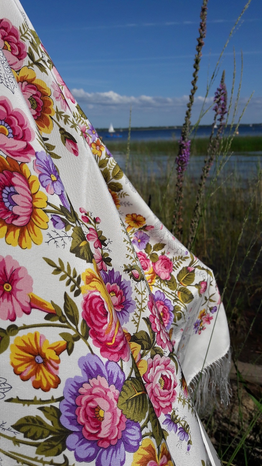 Очень люблю платки и шали Клары Зиновьевой. Нравятся и композиция рисунков, и то, как прорисованы каждый цветок и веточка, и колориты обычно очень гармоничны и продуманы.