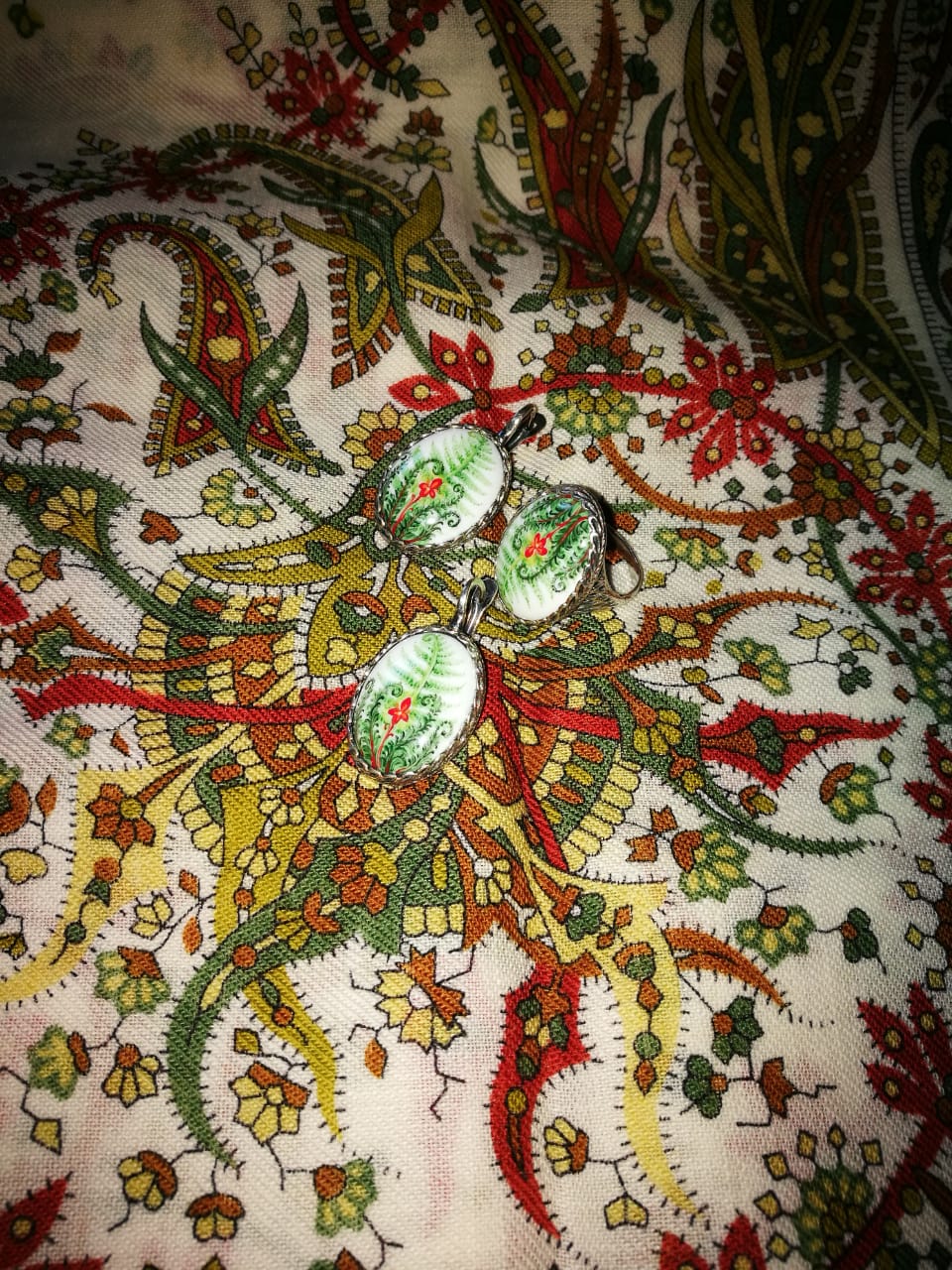 А у меня красота появилась такая, сначала комплект финифти от Бодровой Елены Владимировны, под названием Цветок папоротника, а потом мне повезло, и у меня появился Балаганчик К.С.Зиновьевой. Так они и встретились....