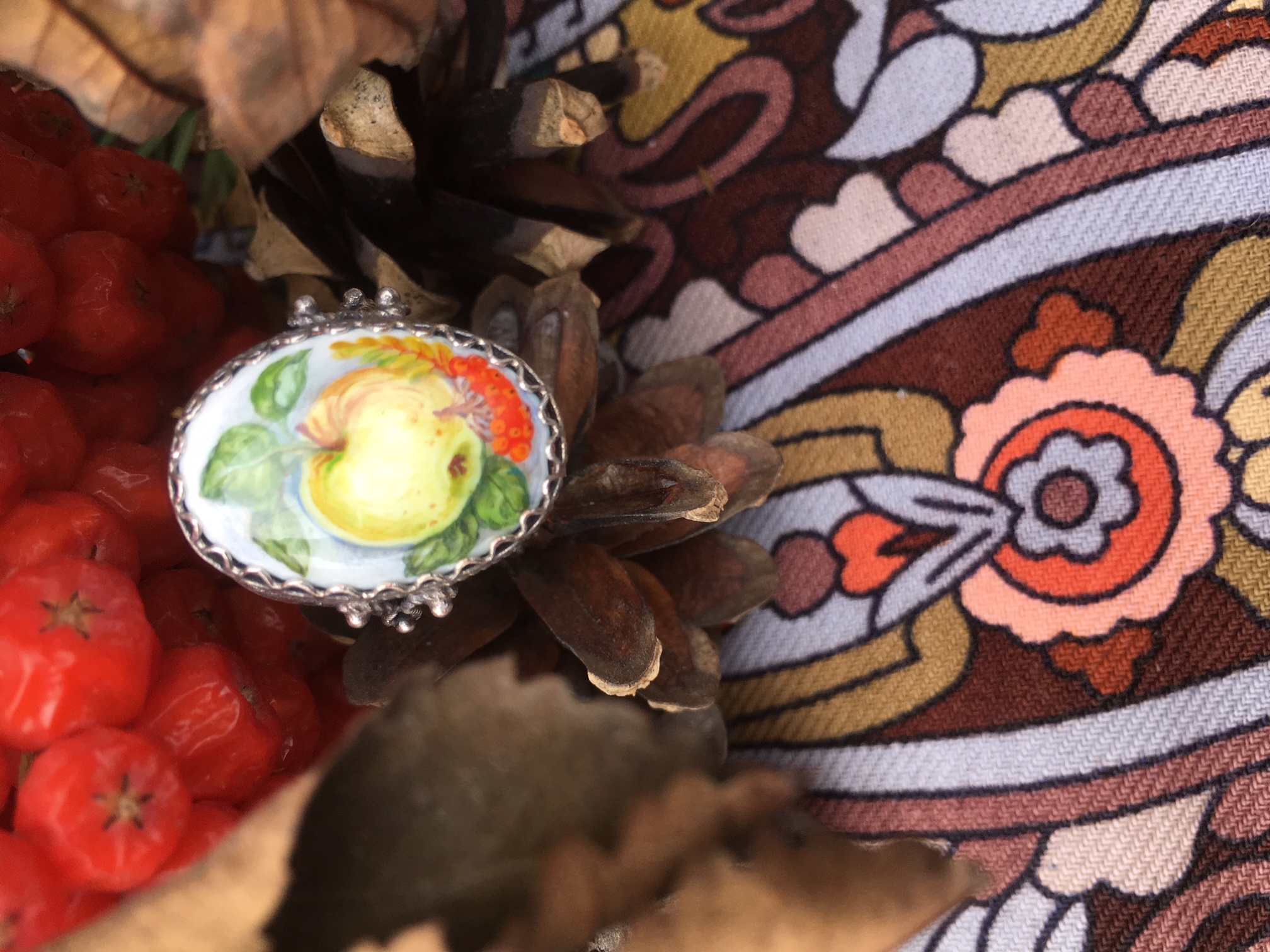 А у меня красота появилась такая, сначала комплект финифти от Бодровой Елены Владимировны, под названием Цветок папоротника, а потом мне повезло, и у меня появился Балаганчик К.С.Зиновьевой. Так они и встретились....