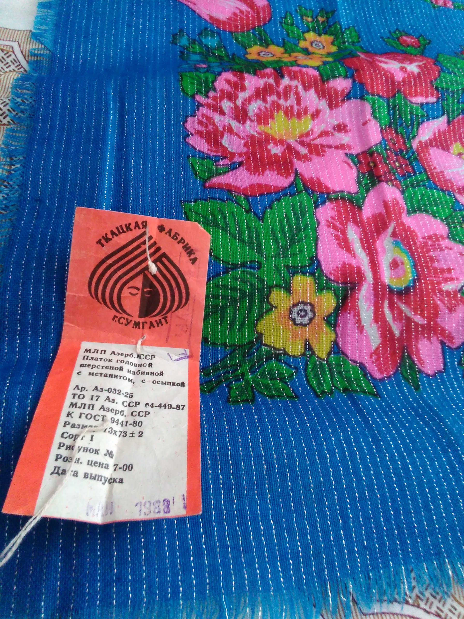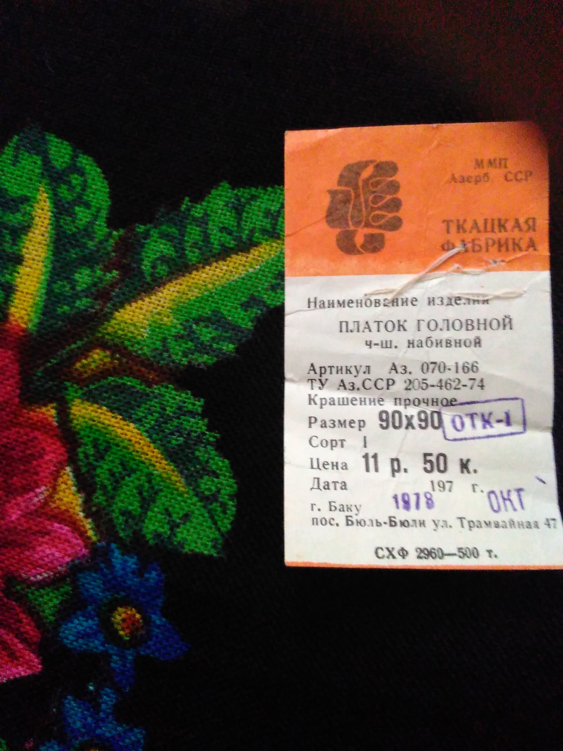 Этот платочек в каталоге не нашла, этикетка к нему пришита ниткой, на этикетке: г. Сумгаит, май 1988г., размер 73 на 73