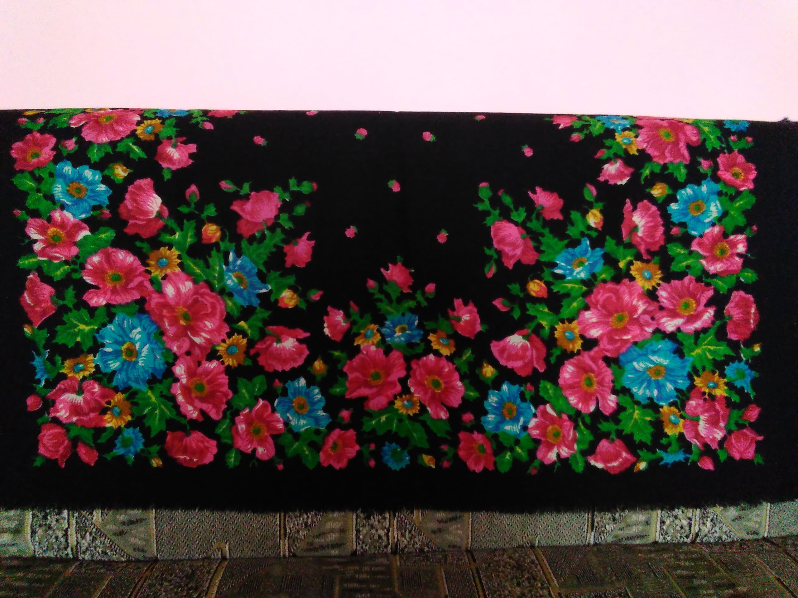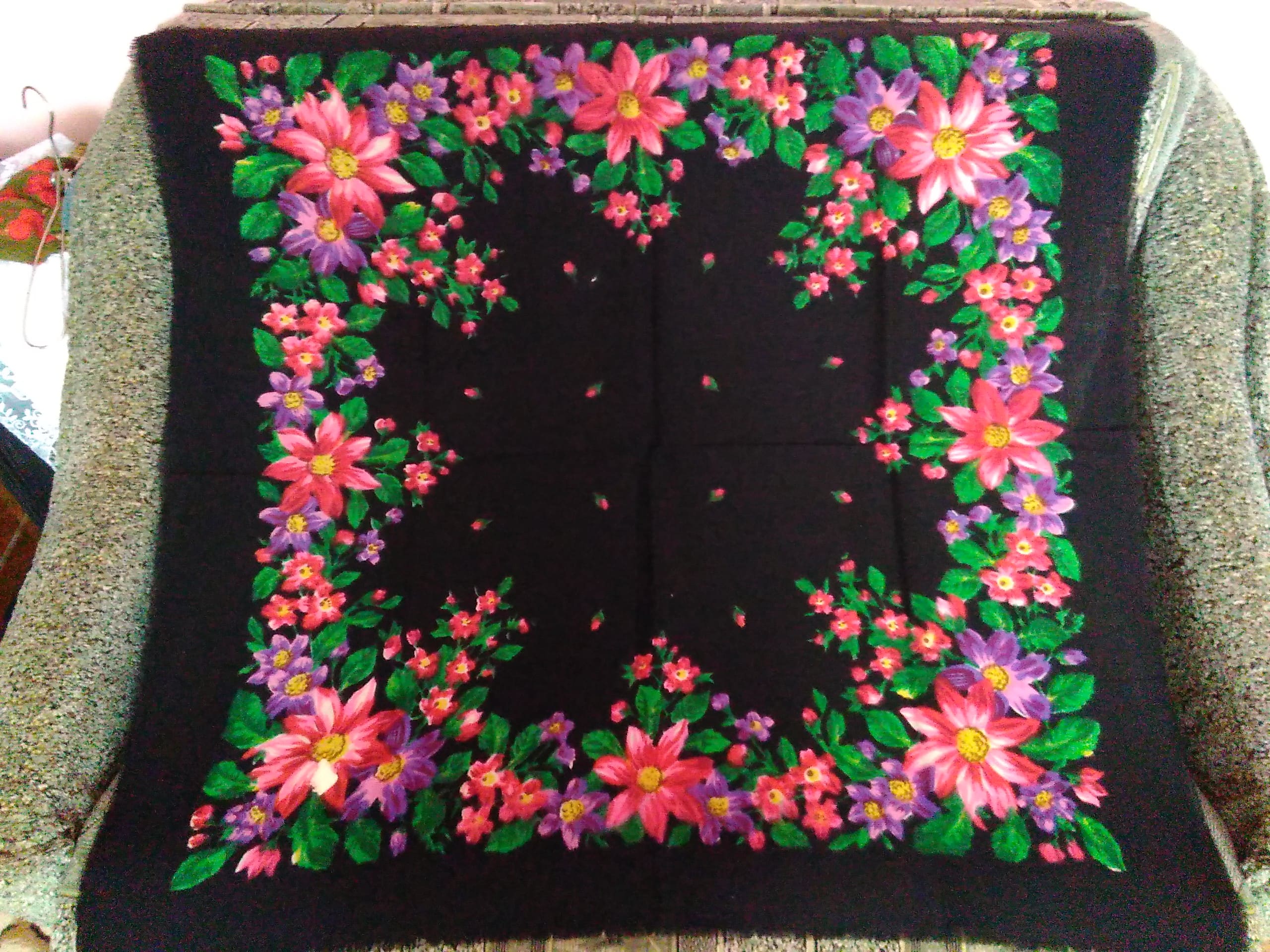 Это сестренка мне фото прислала. Мамины платки советских времен, более 40 лет их помню.Сомневаюсь на счет производителя.