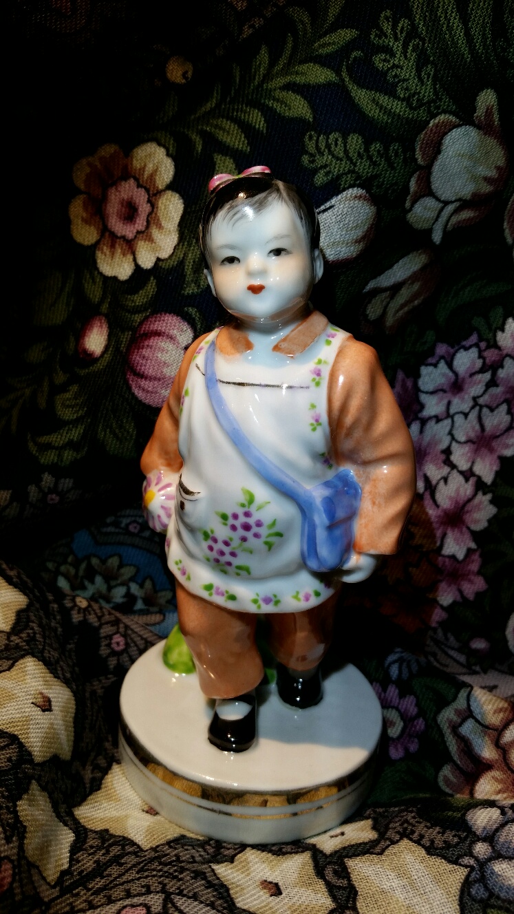 А у меня сегодня одна из обещанных)) "Девочка идущая в школу" из так называемого "старого Китая", примерно 50е-60е. Название моё), но видимо- она идёт первый раз в школу, в руке астра, через плечо- школьная сумка, сама малышка и пока не пионерка )) отсюда делаю аывод, что идёт в первый класс!)) И платок Над серебряной водой 15