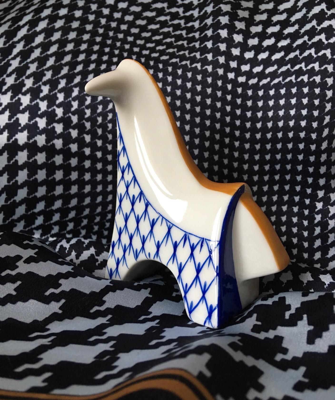 Но я - снова "о лошадках". "Косинус" выпускался в разных видах рисунка. Знаю, что были рисунки "Иней", "На арене", "Голубой". А у меня еще один - скульптура ИФЗ «КОСИНУС (синяя сетка)», авт. Копылков К.М. Скульптура «КОСИНУС (синяя сетка)» выпущена в 2013 году в лимитированной серии жанровой скульптуры ИФЗ, выпуск приурочен к 70-летию создания легендарной «Кобальтовой сетки» ( 1943 год...)