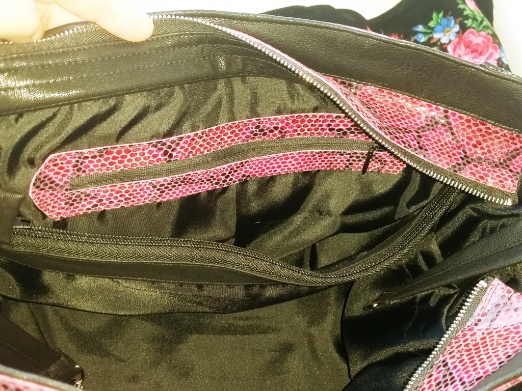 В сумке 9 карманов. Один снаружи, 8 шт. внутри. По боковым стенкам по карману, для пакетов и бутылочки с водой. Которая сторона к себе прижимается 1 втачной, 1 карман на замке через всю ширину сумки (для докуметов) и между ним и стенкой сумки еще один карман получается. и на внутренней стороне, под кисточками еще 3 пришивных кармана. для сотового, очков и еще для чего нибудь. . И все карманы по прилегающим сторонам, т.е. вся площадь сумки свободна.