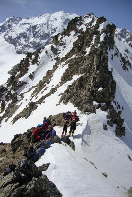 в большие походы я ходила три раза в мае, в последние десятилетия май - это конец зимы на Кавказе, то есть весна всё более холодная становится; снега очень много, он тает, иногда по нему, чтобы не проваливаться по грудь с тяжеленным рюкзаком, ползали (щелкнуть по первому фото). Поэтому лучше всего выходить из лагеря на тропу часов в 5 утра, ближе к обеду - увязнешь.
