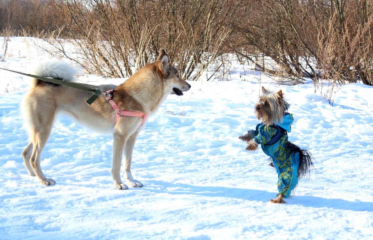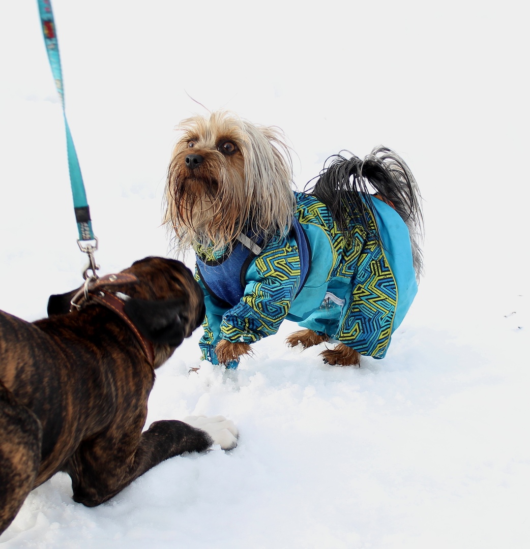 Модница в лазоревом костюмчике умоляет Фиму подарить ей поводок любимого цвета. Наша собачка, единомышленница форумская, все понимает в колоритах.