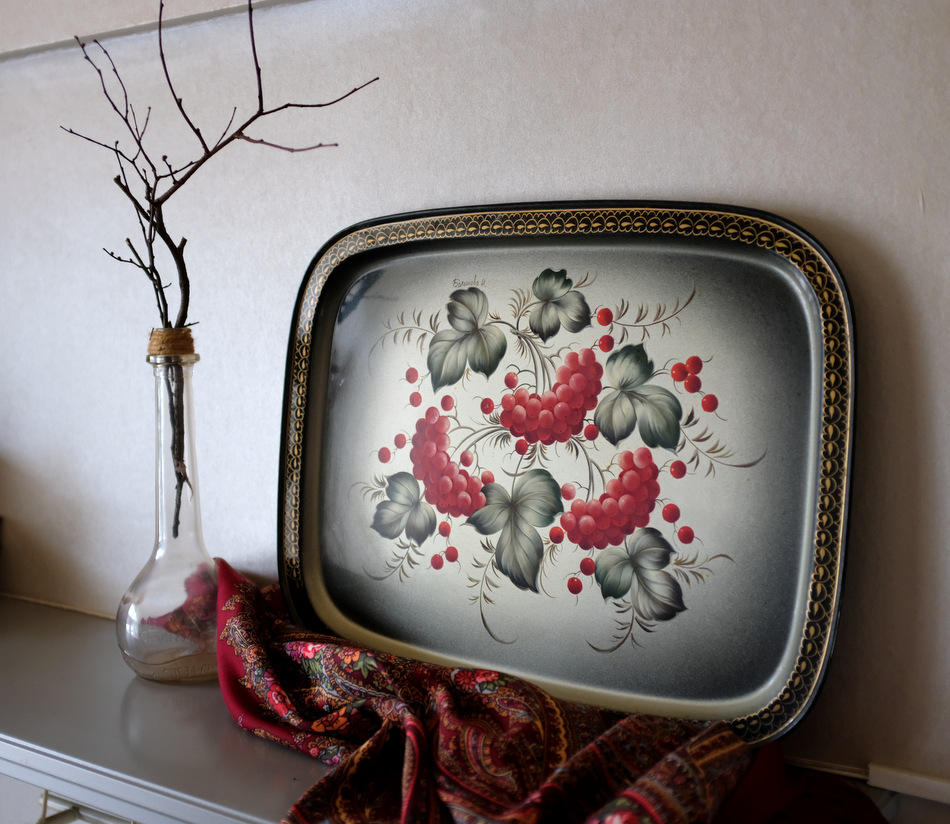Я всегда выбираю в свою коллекцию необычные и нестандартные жестовские подносы. Вот и этот - не с пышными цветами на черном, а с очень лаконичным, изысканным рисунком, серый с зеленовато-серыми листьями и горящими ягодами красной калины.