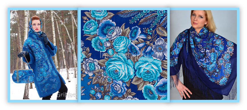 На шерстяных платках «Южанка» Белокур Наталии, «Весеннее утро» Дадоновой Ирины и «Майя» Регуновой, "Варенька" Зиновьевой Клары , "Признание" Елены Жуковой мы видим необычные синие розы. Они говорят нам, что нет ничего невозможного, главное только захотеть и даже розы могут стать синими. (из инета)