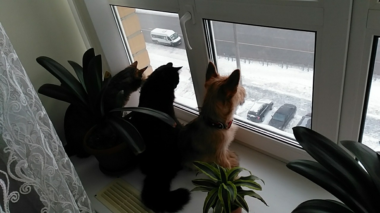 Весёлая команда,всё- то им интересно! Или хозяйку с работы ждут.Умилительно.