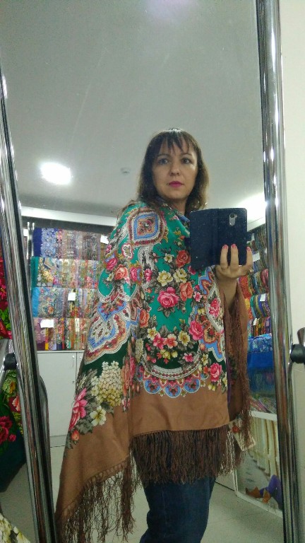 Княжну купила в подарок. Гортензии очень хороши, всё благородно, при этом платок именно павловопосадский по стилистике (конкуренцию составляли розовая и синяя Королева красоты), и в платке совсем нет темных оттенков, которые так отпугивают неплаточные души. Цвета подходят одариваемой (мысленно прикидывала).