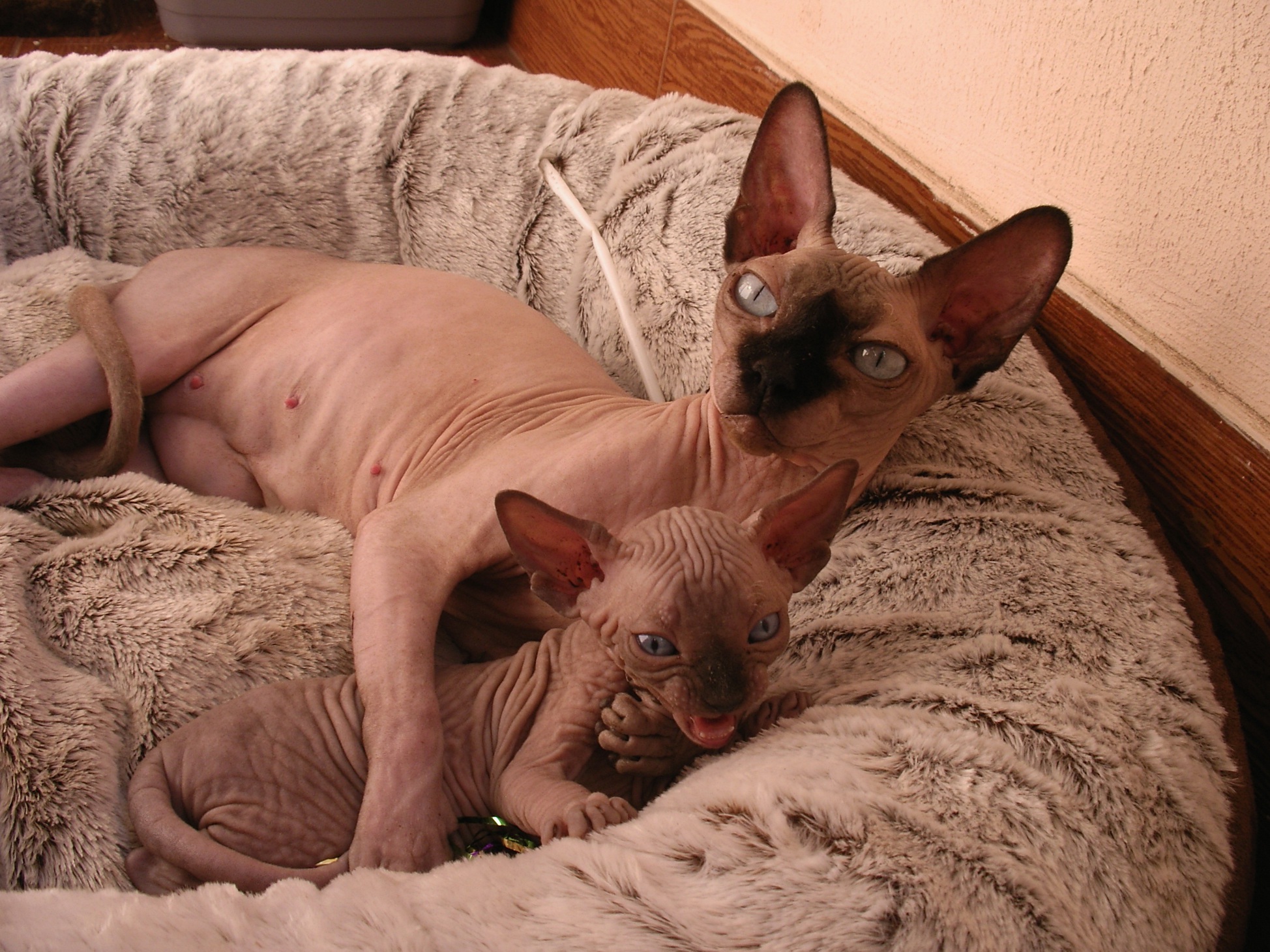 У меня еще сибирская кошка и подобранная домашняя. Интеллект у всех на одном уровне, и те и другие сообразительные. Но сфинксы дают еще необычные тактильные ощущения. В общем, равнодушных нет.
