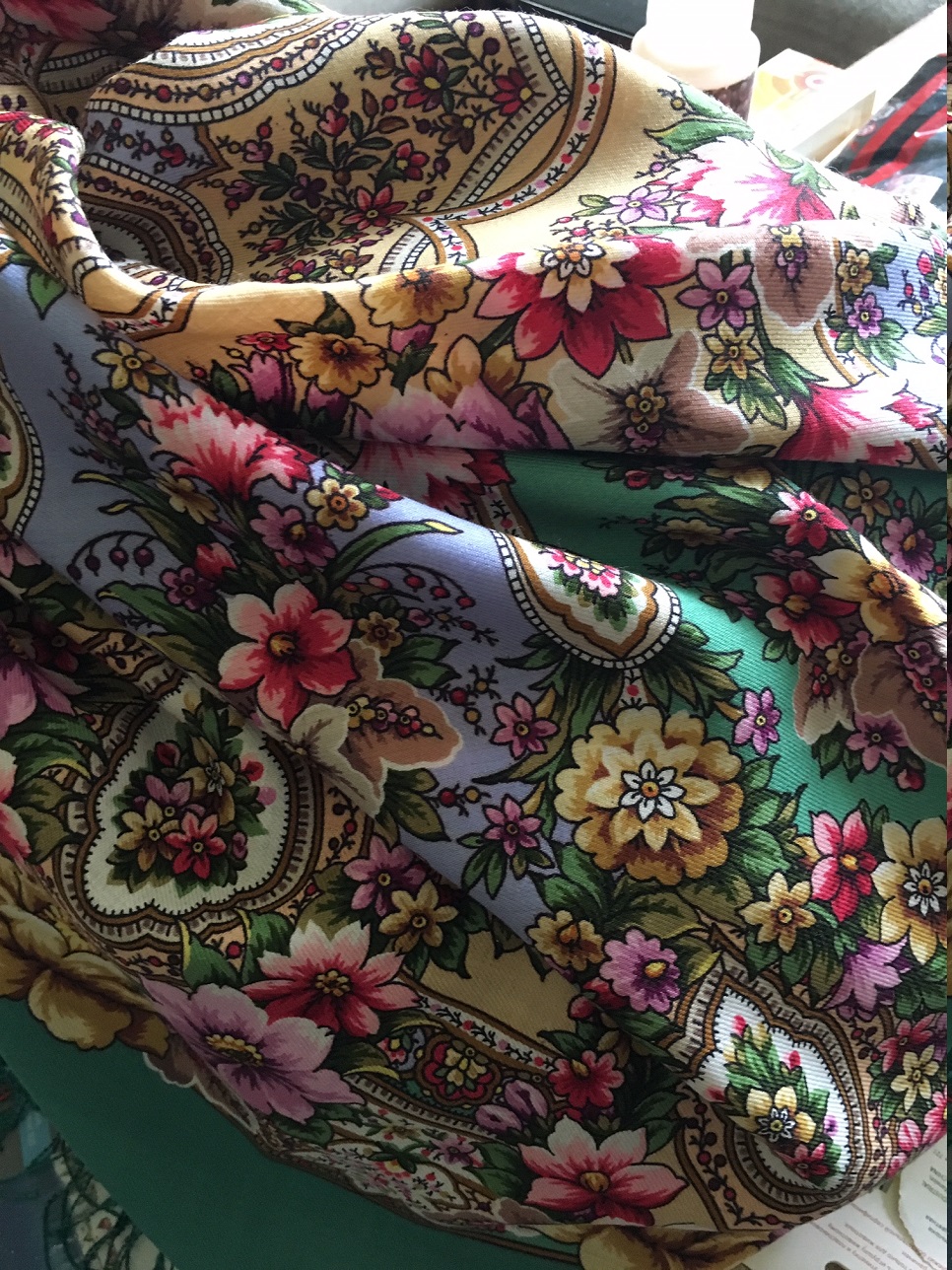 Это тоже весна. И купила этой весной. Ассоциации с радостным настроением и цветущим яблоневым садом, не по колористике, а по тому, как сочетание цветов и рисунка отзывается в душе.