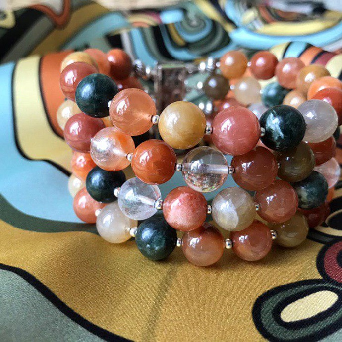 Платочек такой имею. Облизнулась на браслет, а фантазия уж потекла дальше: я бы попробовала в таком исполнении чокер. Тоже четырехрядный, но вместо застежки платок "Солнечный город". Можно завязать хоть сзади, хоть сбоку...