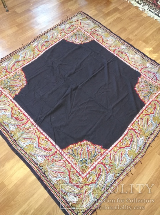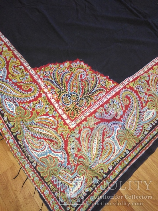 Это не шаль, а платок, очень популярный причем, печают его до сих пор - но фон темно-синий, а не черный, как раньше. Название "Русская красавица".