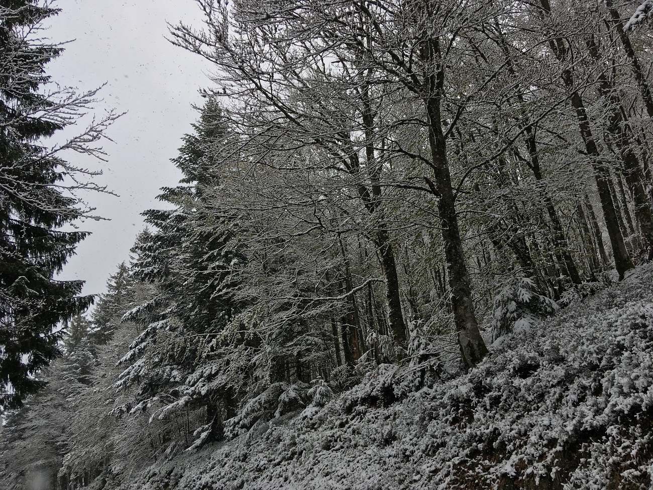 Слава интернету, сразу нашли пару мест, нужно подниматься наверх, но с машиной это не проблема. Звоним, в первом отказ, во втором любезно готовы принять. Едем по серпантину сначала через заснеженный лес.