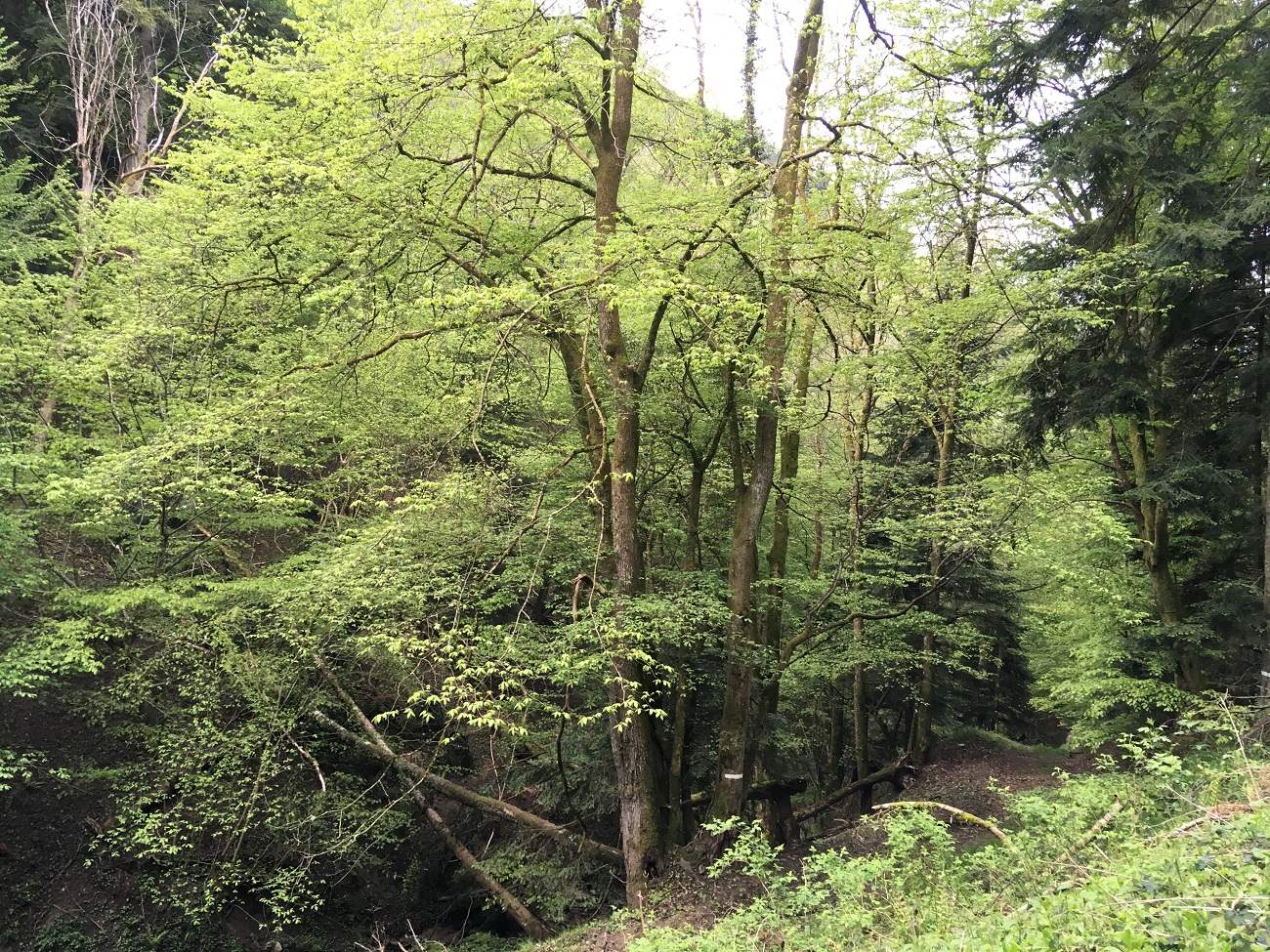 Сначала попробовали спускаться напрямик, но быстро оставили эту затею – слишком круто, повсюду камни, валуны и бурелом, пошли по тропинке, вьющейся по склону траверсами. Шум воды все усиливался, и вот вышли к распадку, куда сбегал каскадом со склона напротив ручей и устремлялся дальше вниз. У воды сразу похолодало. Ручей называется Altenbach (Старый ручей), такие здесь на каждом шагу, питают речку La Thour (приток реки Иль, в свою очередь впадающей в Рейн).
