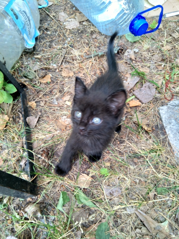 Полностью черный, по-моему мальчик, около месяца, на вид здоров, только блохи...