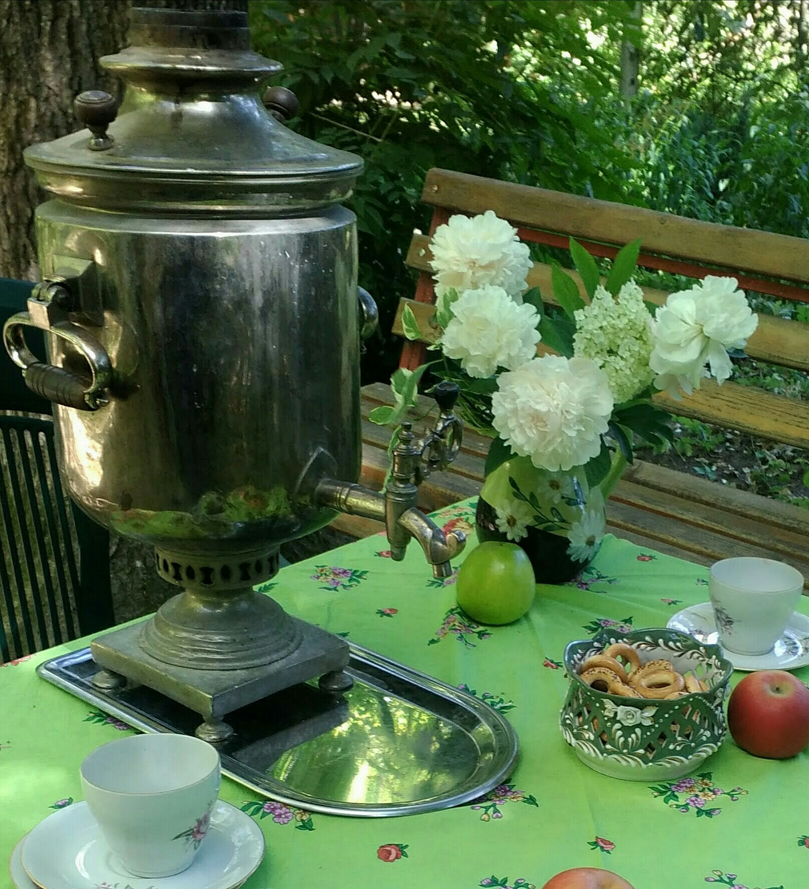 Фото с самоваром как из старого филъма, старая усадъба, вишневый сад и беседка с посиделками за самоваром, просто прелестъ!