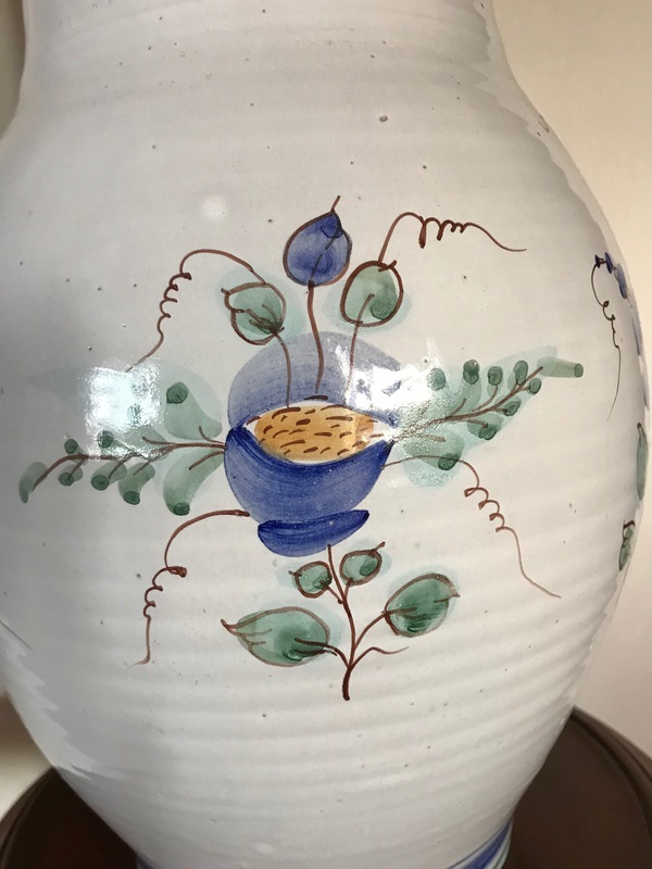 Из старого... довольно крупная ваза, можно сказать средняя--напольная. Купила в 1993 году ( как сейчас помню--за 300 руб), в Гжели, прямо на улице у одного из Гжельских мастеров. Тогда много товара выставлялось рядами вблизи магазинов. Ваза кривовата, не 1 сорта, полностью выполнена вручную--на гончарном круге. Почему то очень люблю ее .