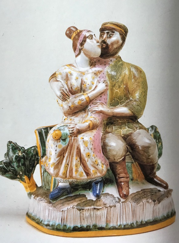 В майолике XVIII века пейзаж был навеян миниатюрой, иконописью, поэтому появились сказочные храмы и терема. Художники 70-80 г , прошлого века создают современное прочтение искусства того времени--интересное направление майоликовой росписи. Объектом их внимания становятся уголки деревенских улочек, небольшие церквушки сел.