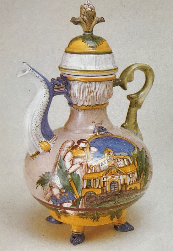 В майолике XVIII века пейзаж был навеян миниатюрой, иконописью, поэтому появились сказочные храмы и терема. Художники 70-80 г , прошлого века создают современное прочтение искусства того времени--интересное направление майоликовой росписи. Объектом их внимания становятся уголки деревенских улочек, небольшие церквушки сел.
