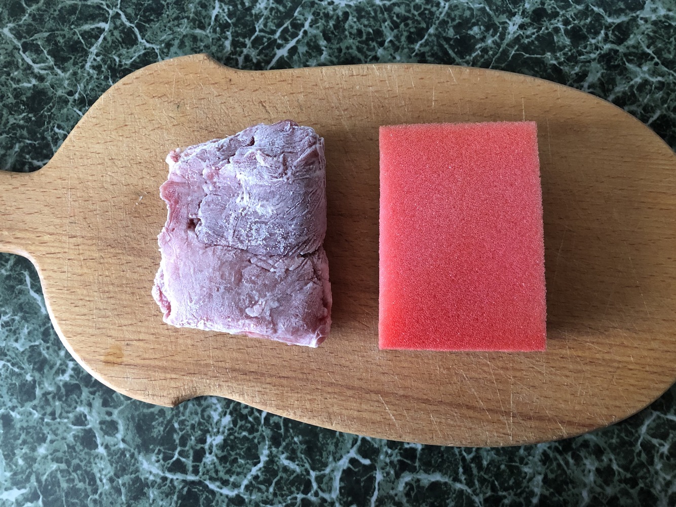 Елена, вес кусочка примерно 100-120гр. Вот для вас. Это два смерзшихся кусочка, рядом (что было под рукой) такая не маленькая губка для посуды.