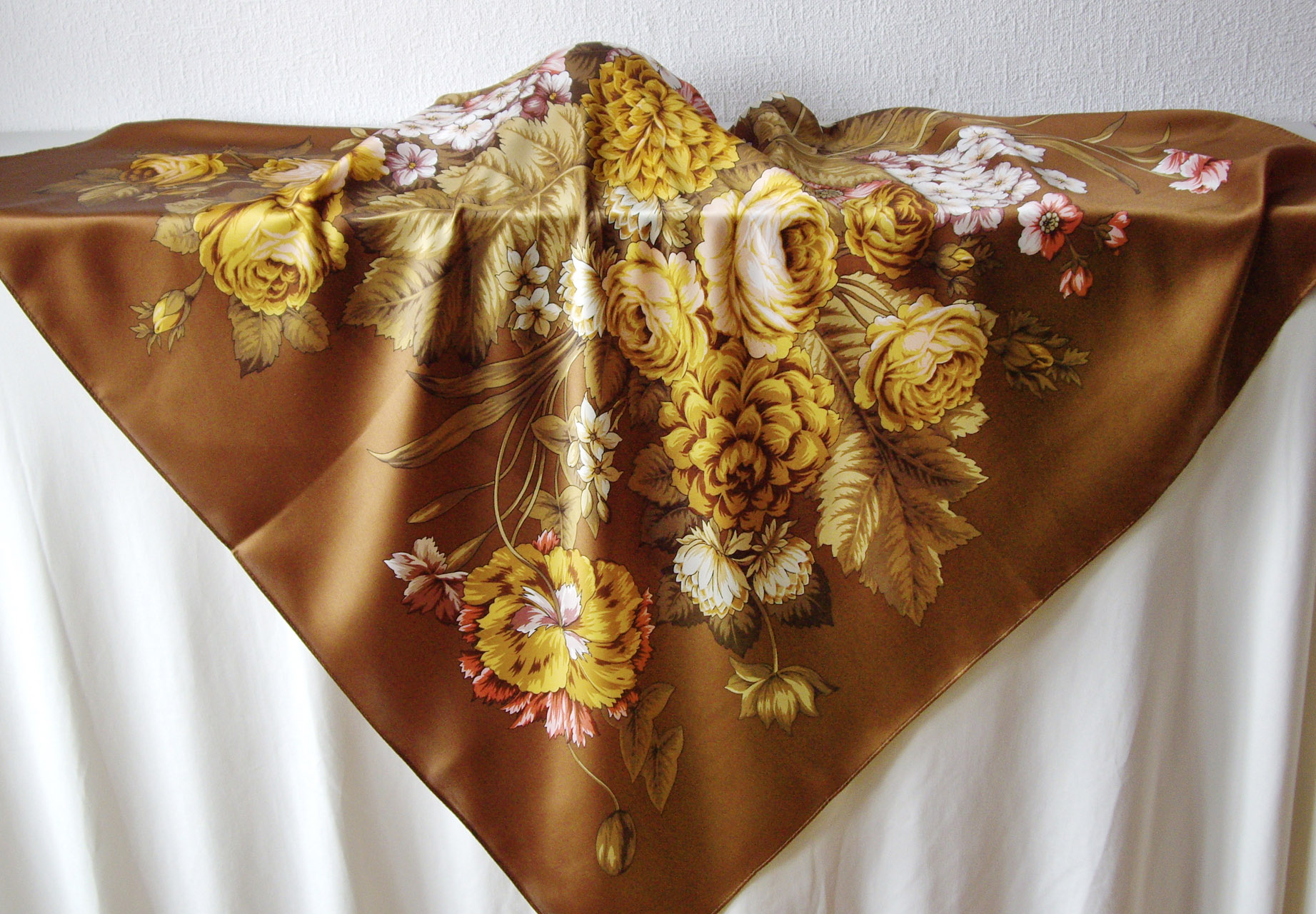 Новое, шоколадно-золотое мерцание восхитительно! И золотая кайма смотрится очень интересно. По-моему это первый платок у которого кайма светлее основного фона.